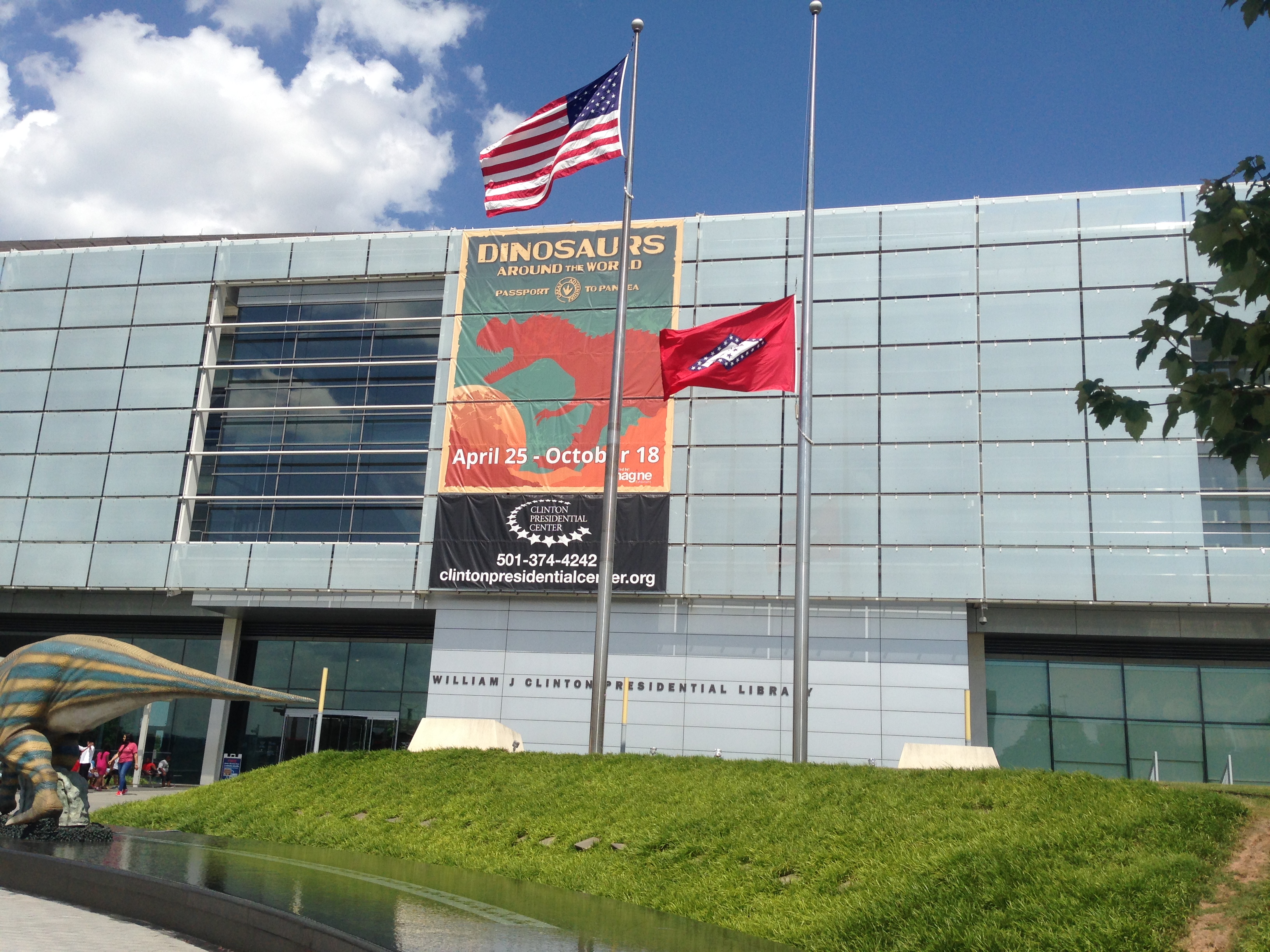 FullSizeRender_3We got to Little Rock, AR about 2.5 hours later and went directly to the Clinton Presidential Center/Library. For $7 you get access to 3 floors of President Clinton History and a trip down memory lane. They also had a special exhibit about Dinosaurs, and had we not just seen Jurassic World, we might of been compelled to go through that portion. However, the tour at the Museum started with a video narrated/hosted by President Clinton. Then we walked through the library divided into each year of his 8 years as president, along with asides focusing on specific issues he dealt with during his presidency. It included a full scale replica of the Oval Office and the Cabinet Room. It also has some sweet memorabilia. Both of us being presidential enthusiasts, and Clinton being the president during MOST of our childhood, it was really interesting to spend some time here. Danielle’s favorite part might of been the portrait of Socks, the first Cat. Seeing as though when she was little, she bought a stuffed animal version of Socks and read her Presidents Book religiously.