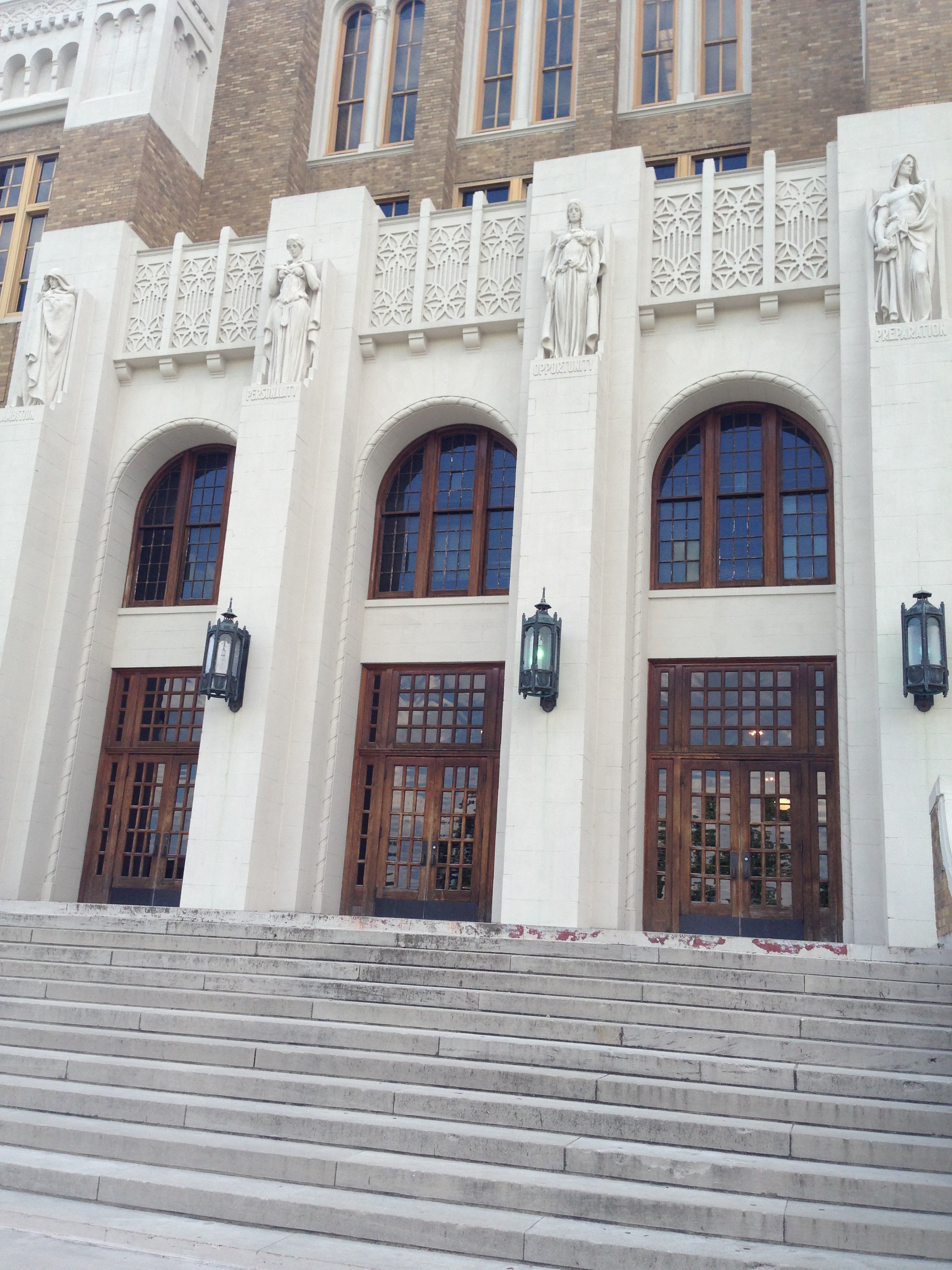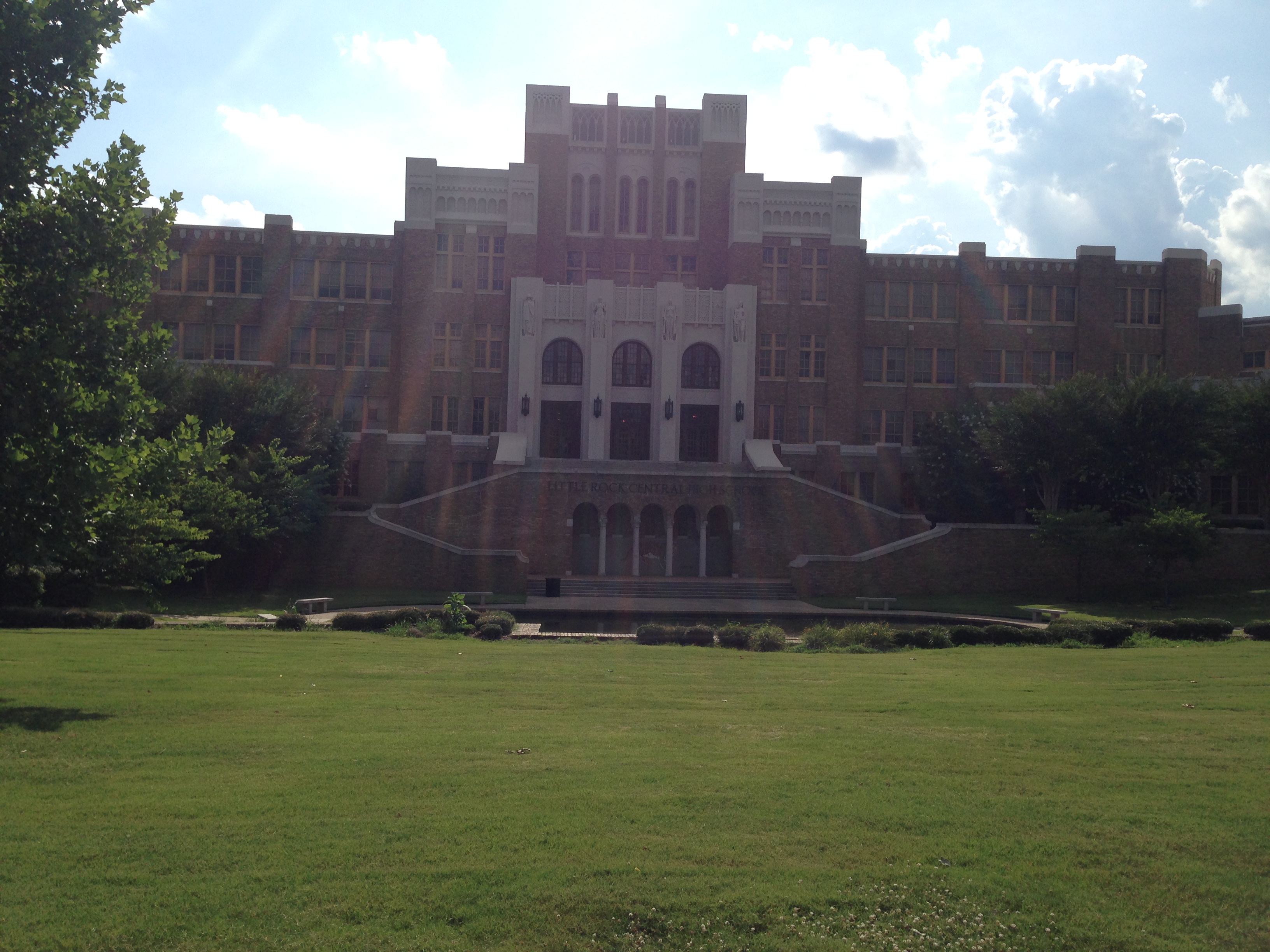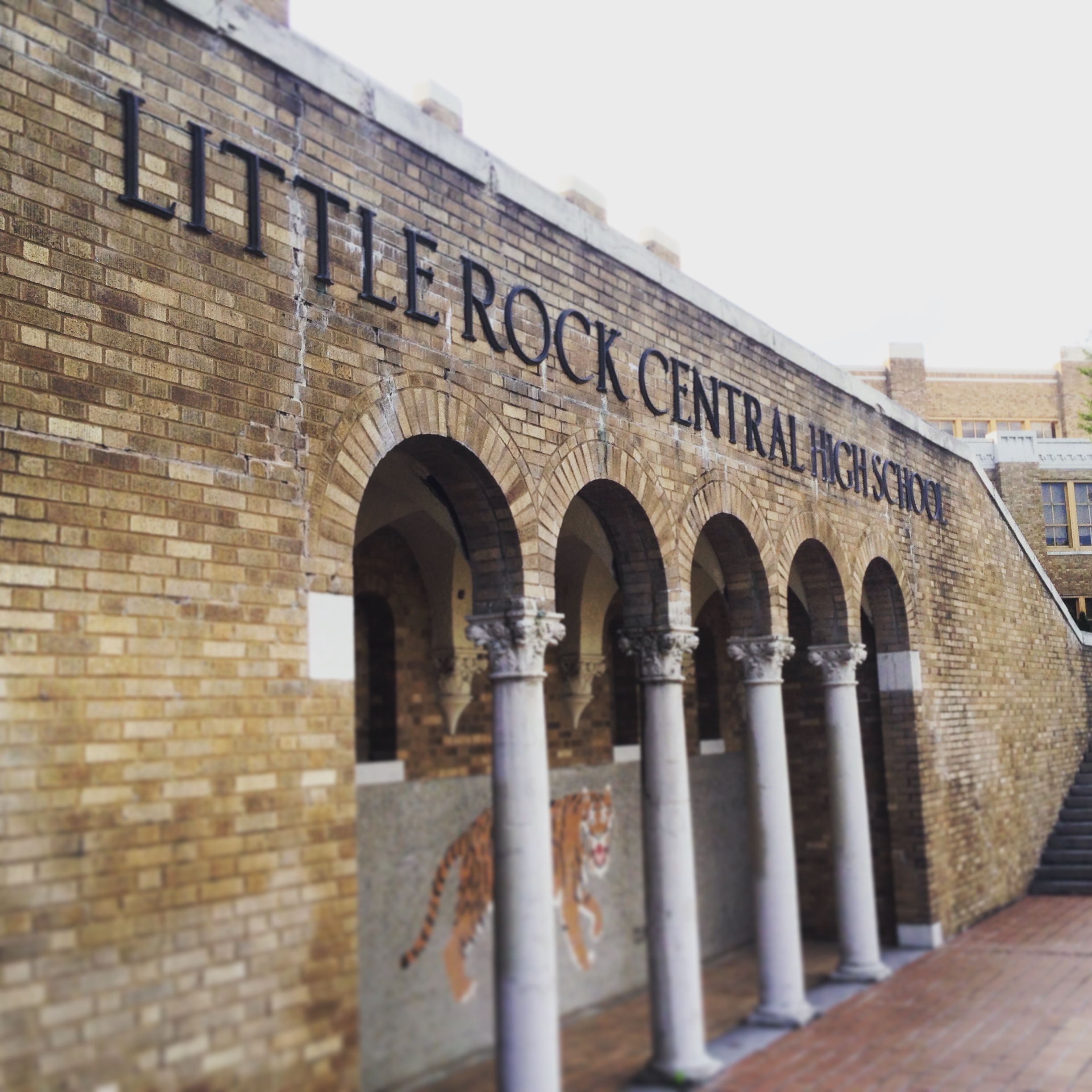 Next, we headed to a National Historical Site in Little Rock. Little Rock Central High School, which was the site of the 1957 integration of the nine students, otherwise known as the “Little Rock Nine“. Still a functional high school today, this building is preserved as a historical site, yet students walk these same stairs everyday. It was almost 5:00pm by the time we got there, so the Visitor Center was closed, so we parked the car and walked right up to the front doors of the high school. Outside are 9 benches surrounding a little pond, each with a name of one of the nine, as well as a 10th bench for “Future Students”. You can walk right up the steps to the school house doors. Above the entrance are 4 statues representing Ambition, Personality, Opportunity and Preparation.