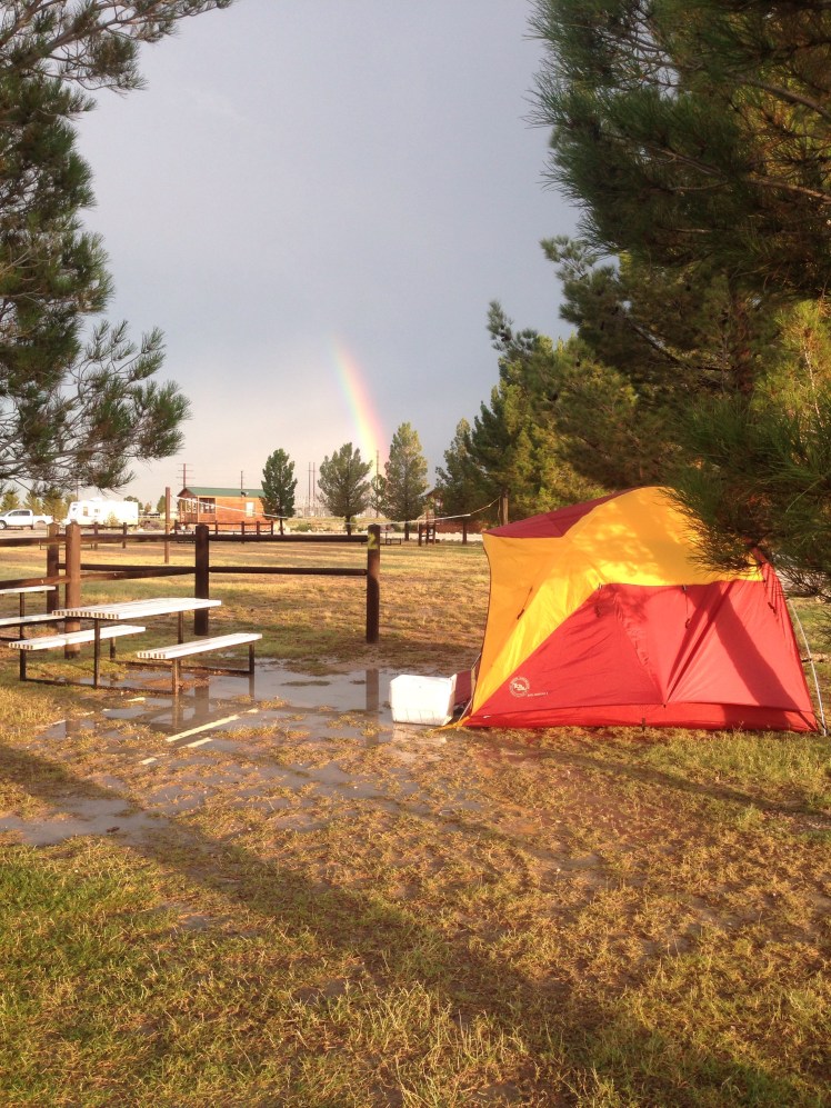 After the hike, which was 750 feet underground and a decisive quadricep workout, we headed to our campsite for the night. We had reservations at the Carlsbad K. O. A. Which was nice if you had a bunch of kids to entertain and your idea of “becoming one with nature” was a lot of traffic. We got in around 6pm and arriving shortly after us was a massive storm which included wind, rain, thunder and lightening. We got the tent set up with just enough time to climb in before the storm started full force. Guess that first camp fire of the trip will have to wait until tomorrow?? So we are in the tent waiting out the storm and decided to just go to the camp clubhouse for dinner. Aka, French fries, Snickers and Coke. Finally the storm passed and we went out to the tent.