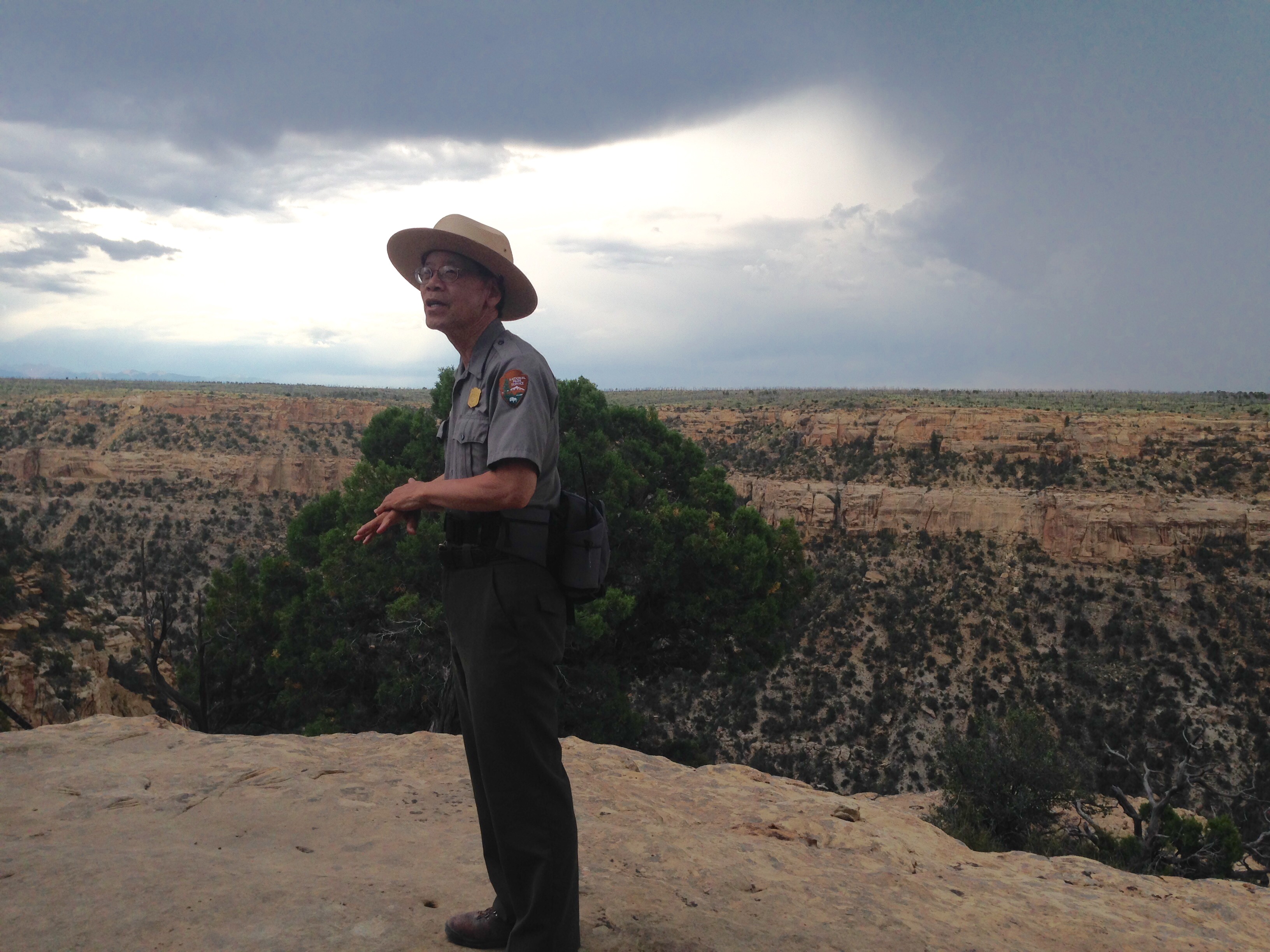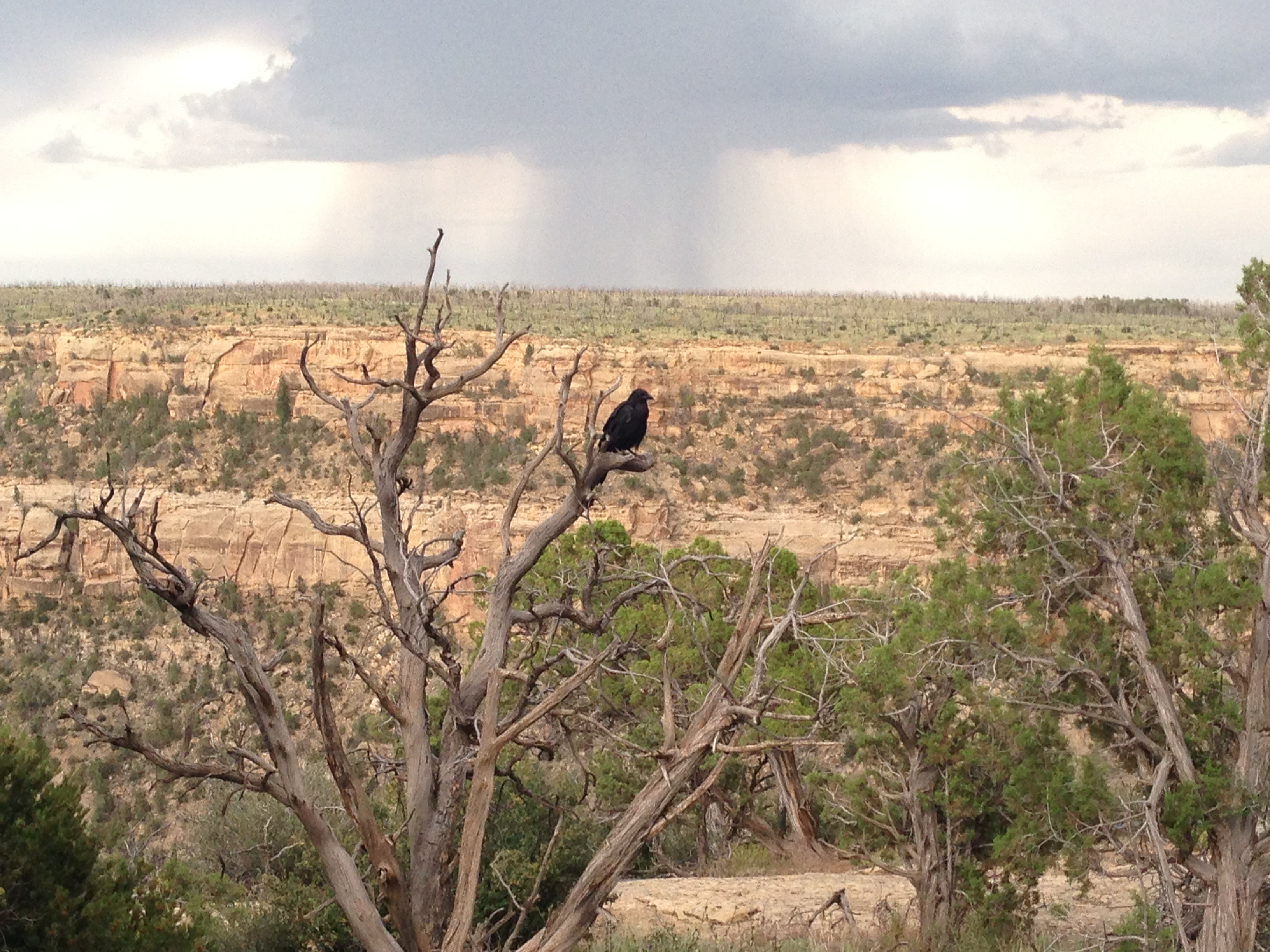 We did experience some shortness of breath on the hike today due to the higher altitude. Or that is at least that’s is what we told ourselves! After refilling our water we headed to the Balcony House area and had 45 minutes to kill. We happened to park right in front of a trash can and we played a game called “Are you smarter than a bear?” As we watched people try to open the safety locked trash can. Just as we started lining up for the tour it started to thunder and a few rain drops. We were afraid they would cancel the tour but oh no. Our ranger, whose name was “Bennett Dear”, I mean if this guy wasn’t born to be a ranger than I don’t know who is, was determined to give us the full tour experience. This one did require going up and down some steep ladders, tight spaces, and crawling through a 3 foot wide space to get out of the other end. It was also an hour long and although balcony house is not visible from any sort of viewing area, you get to walk around around in it when you take the tour. There was a ledge that we kept a safe distance from. The tour wrapped up, and the storm seemed to miss us. We noticed that because we are so high up, and there is relatively nothing obstructing your view, you can actually see the rain clouds. We got a picture of a Raven (or Crow?) with the rain cloud in the background. How every Edgar Allen Poe.