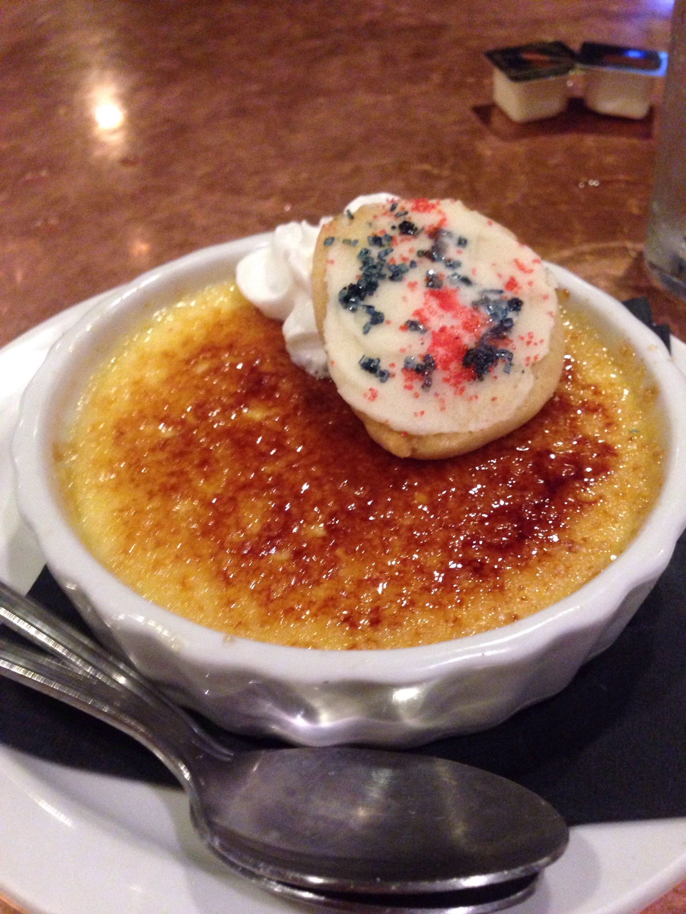 After the parade we went back to Carver Street to avoid the rain and bid some time before the fireworks. We got Chicken Stew and some sort of cherry almond salad. Plus some All American Creme brûlée.