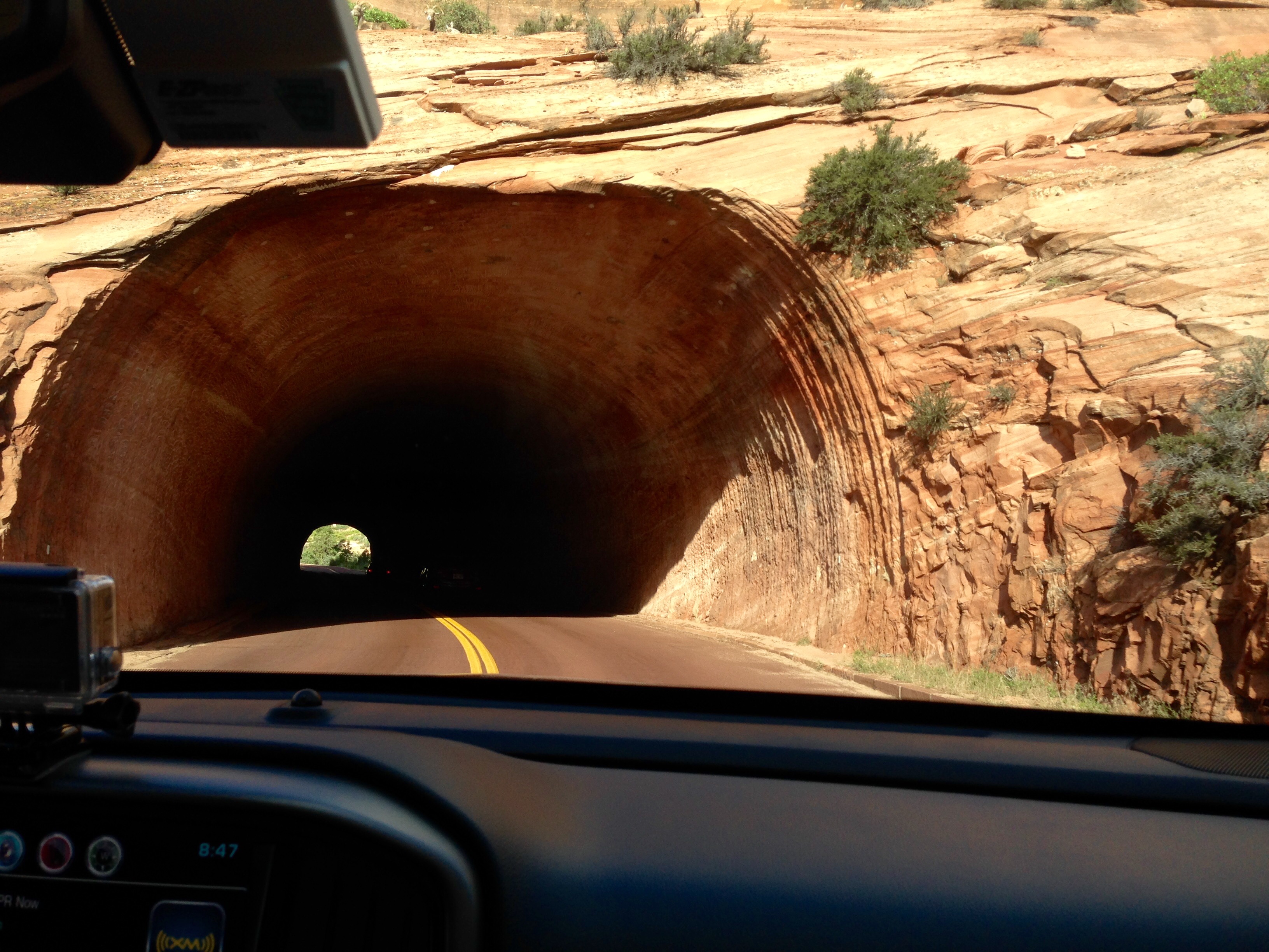 This morning we drove about 1.5 hours to Zion National Park. This is the 5th and final National Park in Utah that we needed to visit! We now have officially been to all of the parks in Utah!! Zion is a big park with outstanding views. In order to get there from Bryce Canyon you drive the Mt. Carmel road that was constructed with tunnels through the sandstone mountains. The first one you drive through is this small one, and there is another one that is about a mile long closer to the park.
