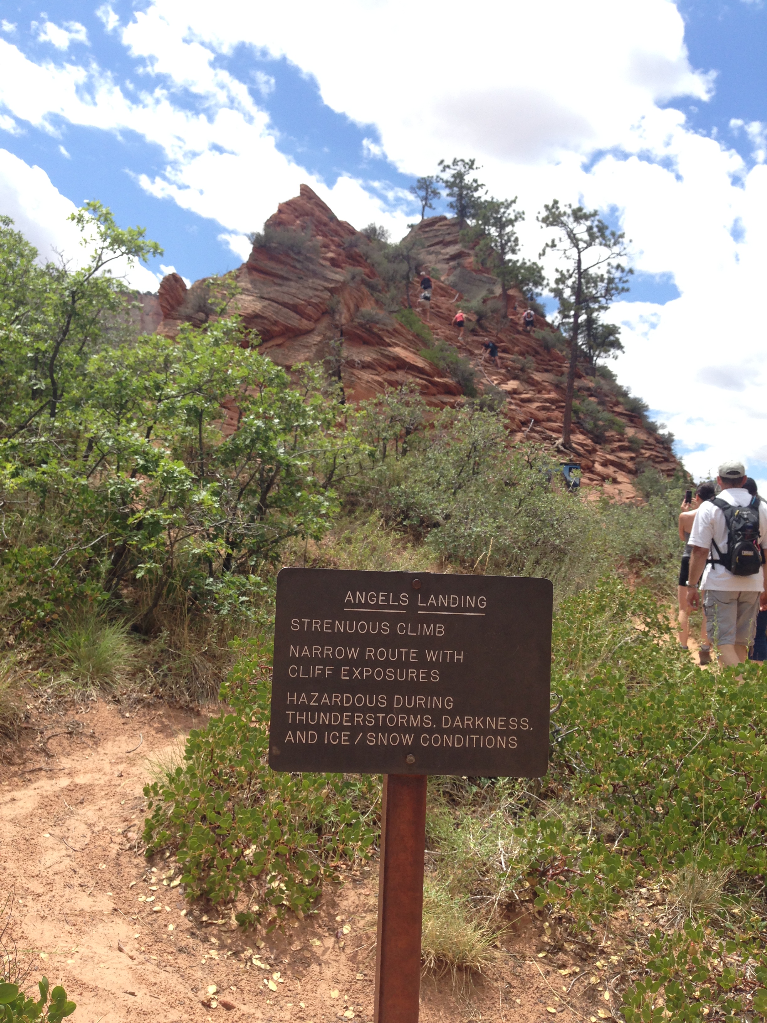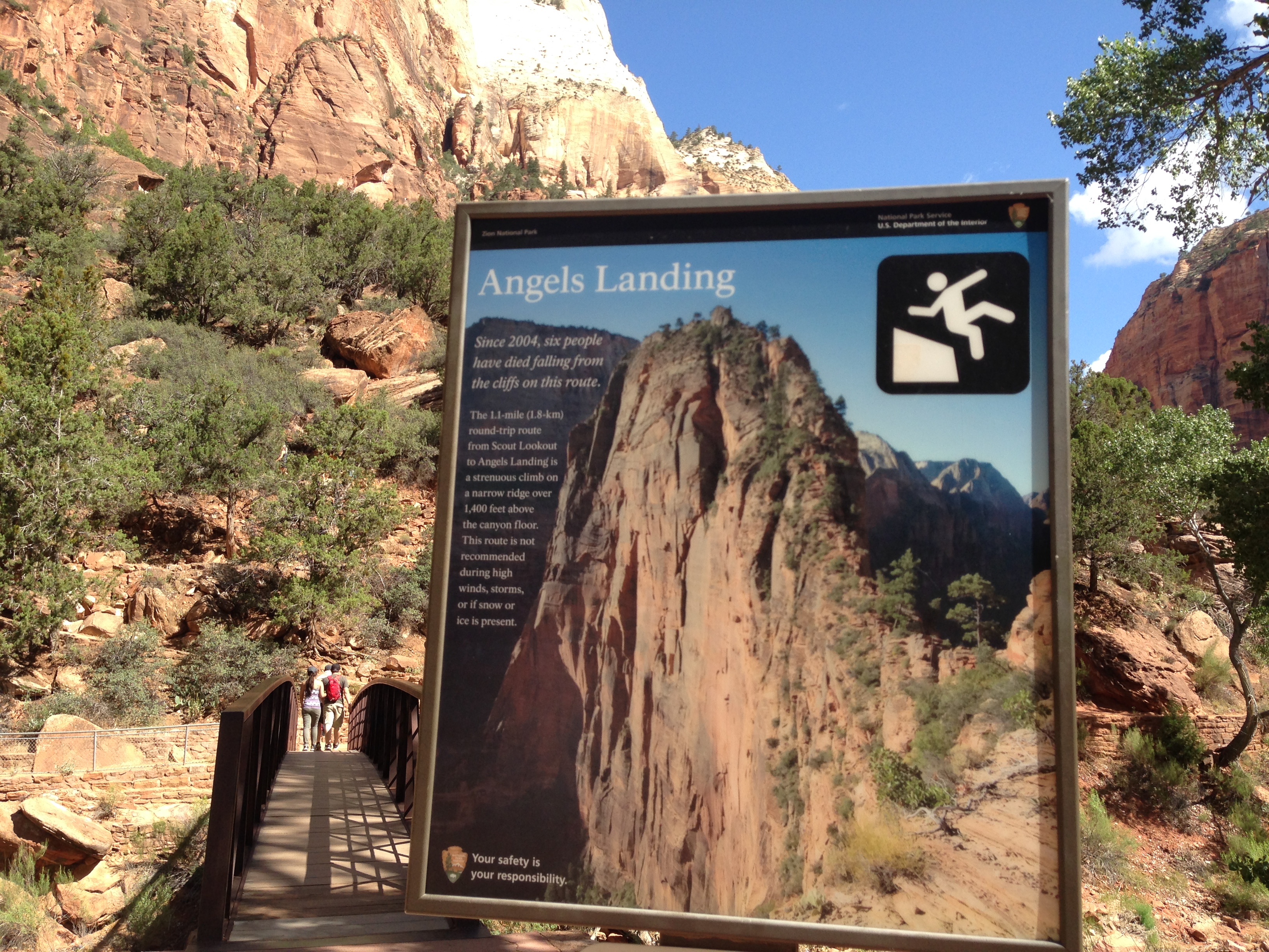 There are 2 visitor centers and we started off from the Zion Canyon center. It was the closest to the road we entered on and also the most popular. There are 2 major hikes that draw people from all over to Zion. “The Narrows” or “Angel’s Landing”. The Narrows you walk through tall narrow passages in the mountains were there is water, at some points you have to wade through it. Or Angel’s Landing, which is a hike up the open face of a cliff so high that it was named ‘Angel’s Landing” because only Angels could land there. There wasn’t enough time in one day to do both. So we decided to try the Angel’s Landing hike. All of the other hikes we have done so far on this trip have just been training runs for this one. This so far has been the steepest, most switchbacks, and most hair-raising hike so far. So at the start of the trail you are greeted with this sign: