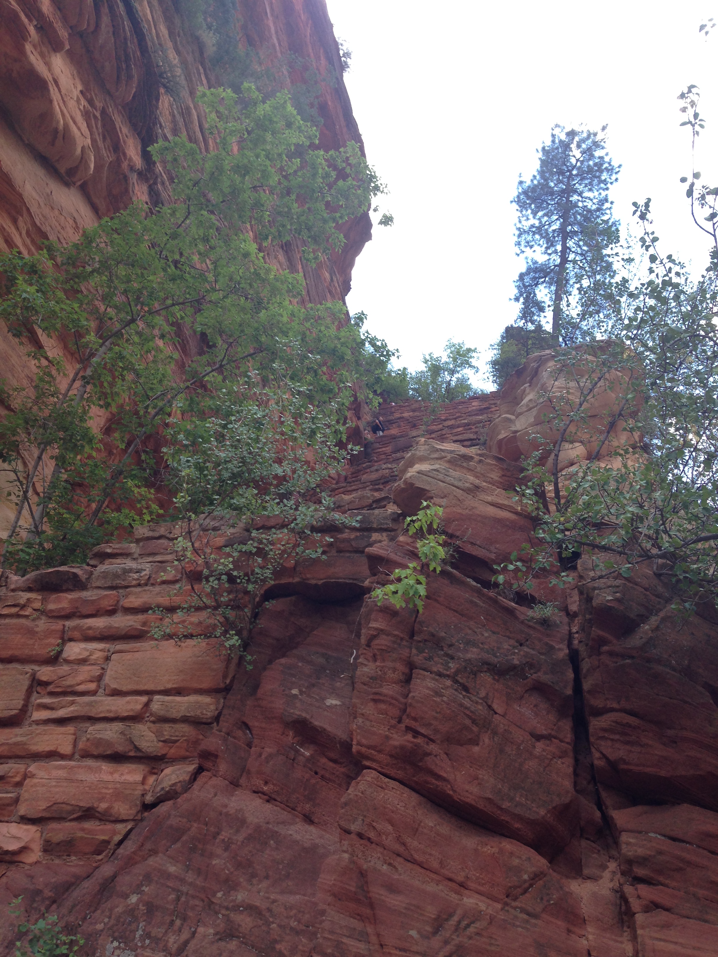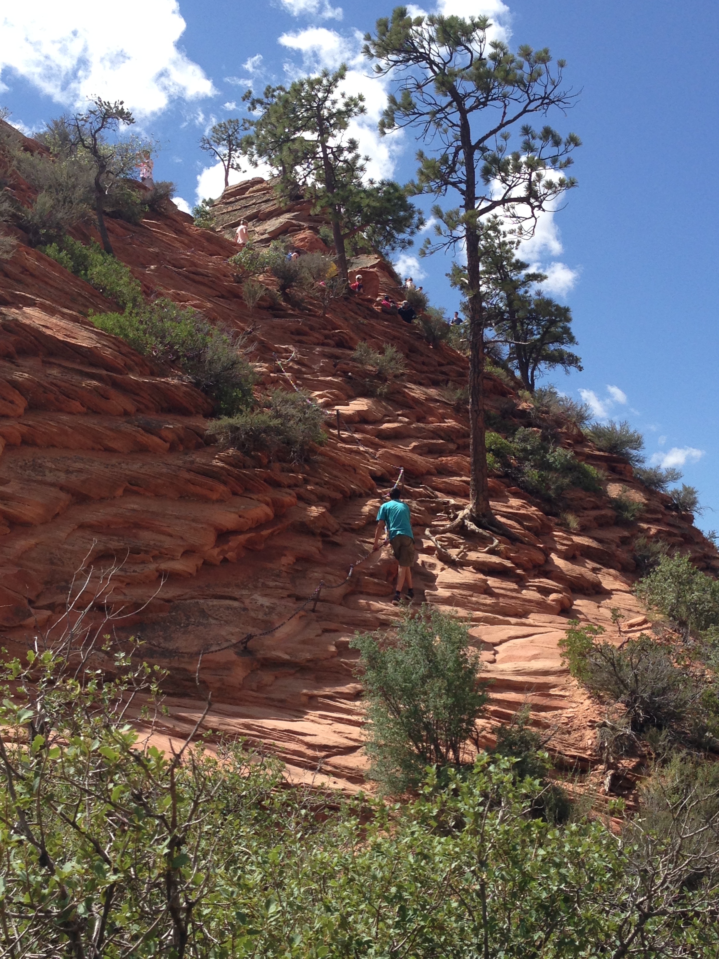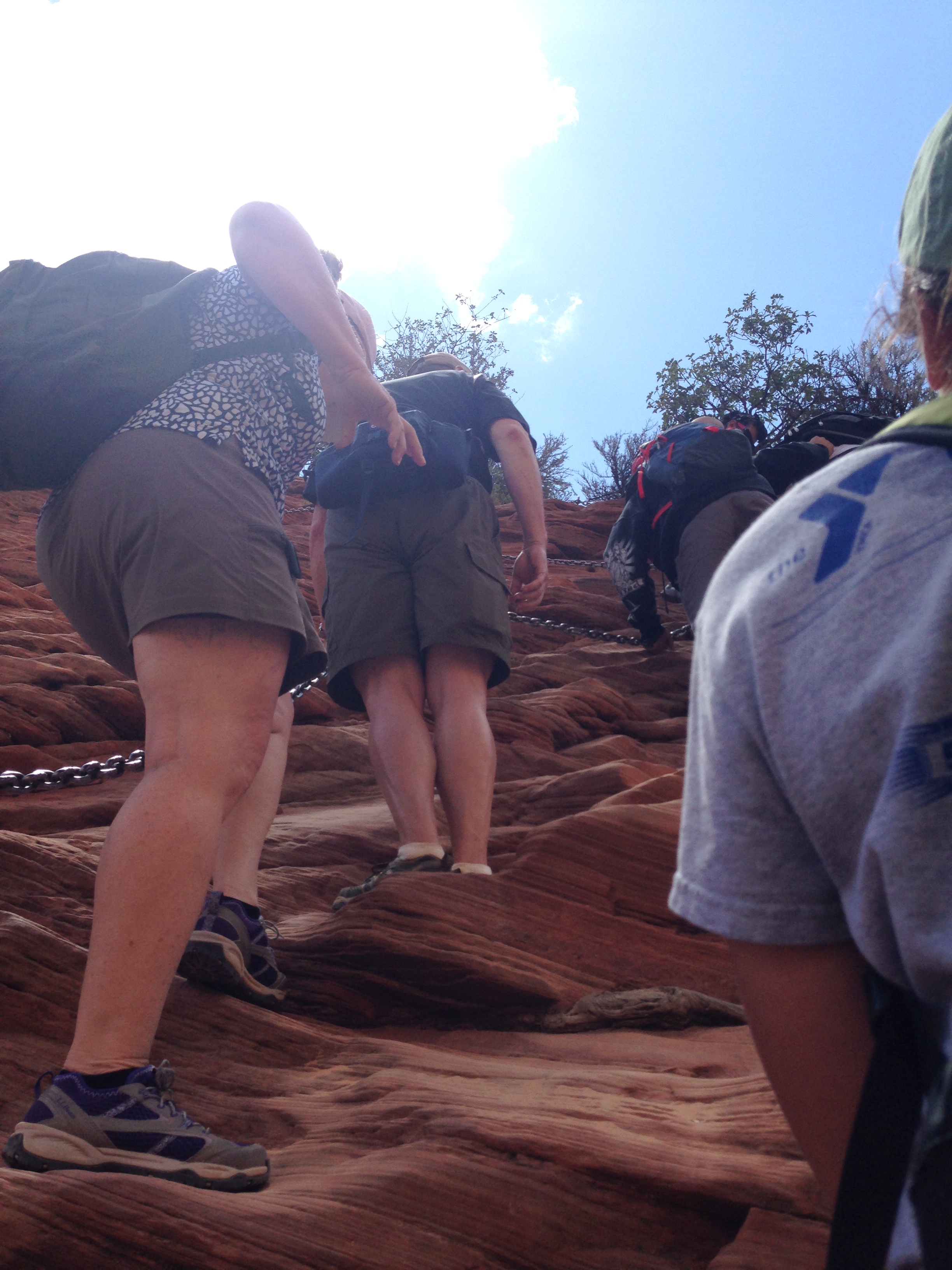 And then if you have lost your mind, you can continue another .5 miles up the side of the cliff known as Angel’s Landing. (total hike is like 5.5 miles round trip). There is a chain rope nailed into the rock that you hang on to. But you have to do a sort of tango because as you are climbing up, people are coming down. Here are some pictures I took before we started and then once when we were stopped at a road block. The camera promptly went away because you need all hands and feet focused on this climb.