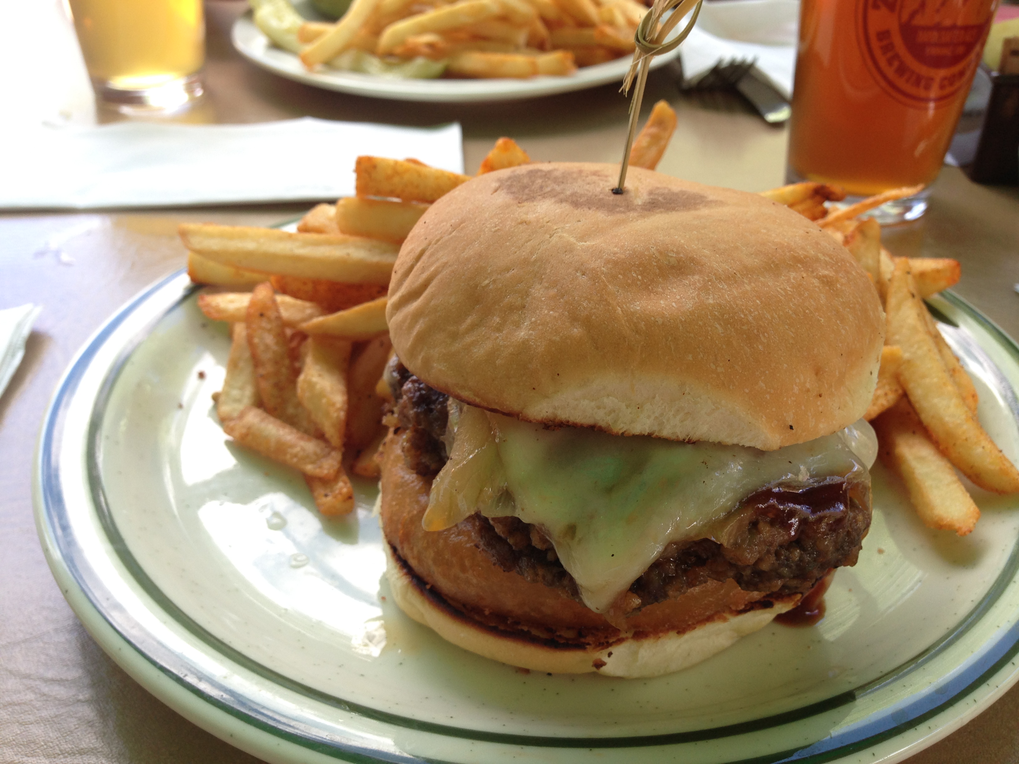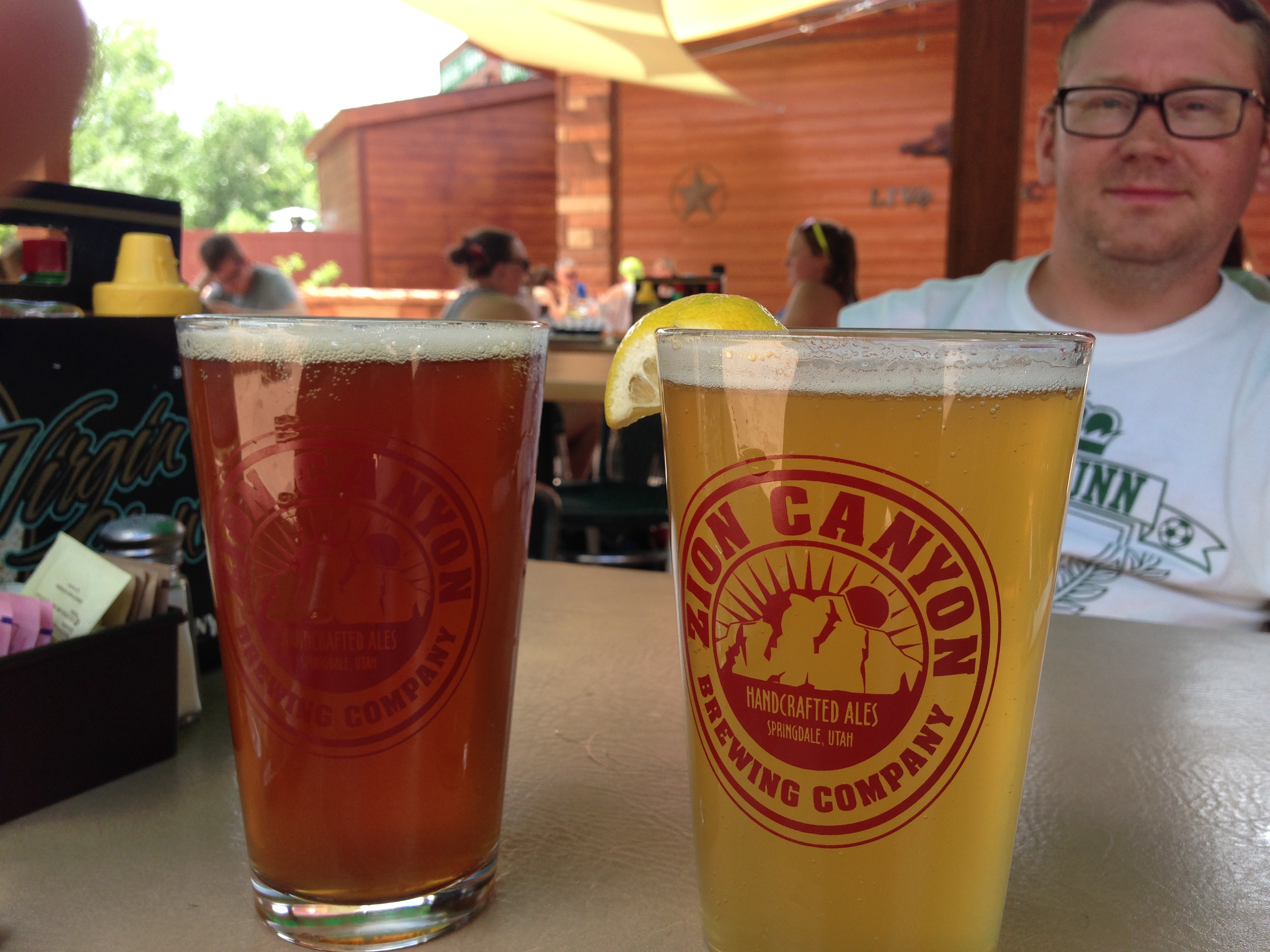 We took the shuttle back tot he car, changed our shoes, and walked right outside of the park’s gates to Zion Canyon Brewing Company for lunch. It was a nice place, outdoor shaded seating with microbrews and good food. We got a Curry Chicken Salad Wrap, and Buffalo Meatloaf Burger. I’m sure you can figure out who got what.