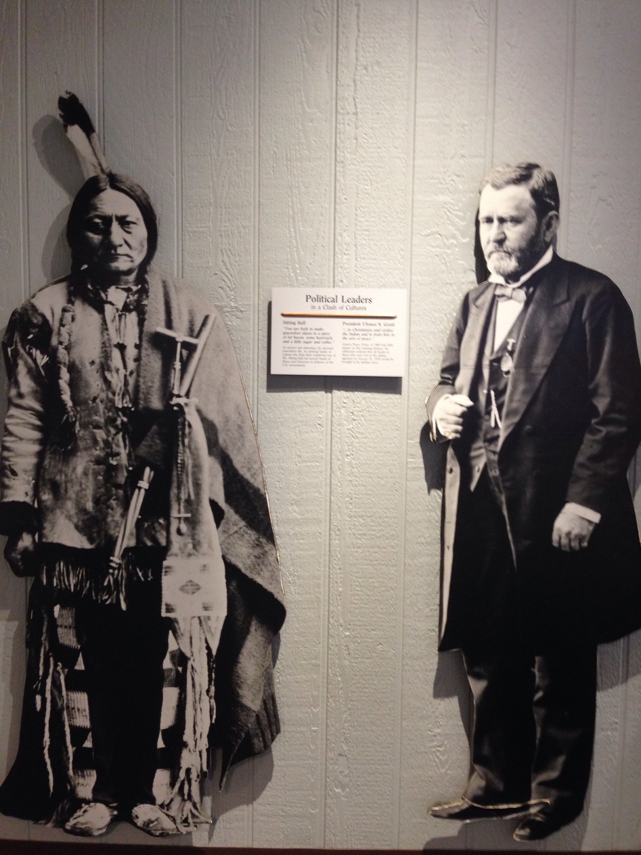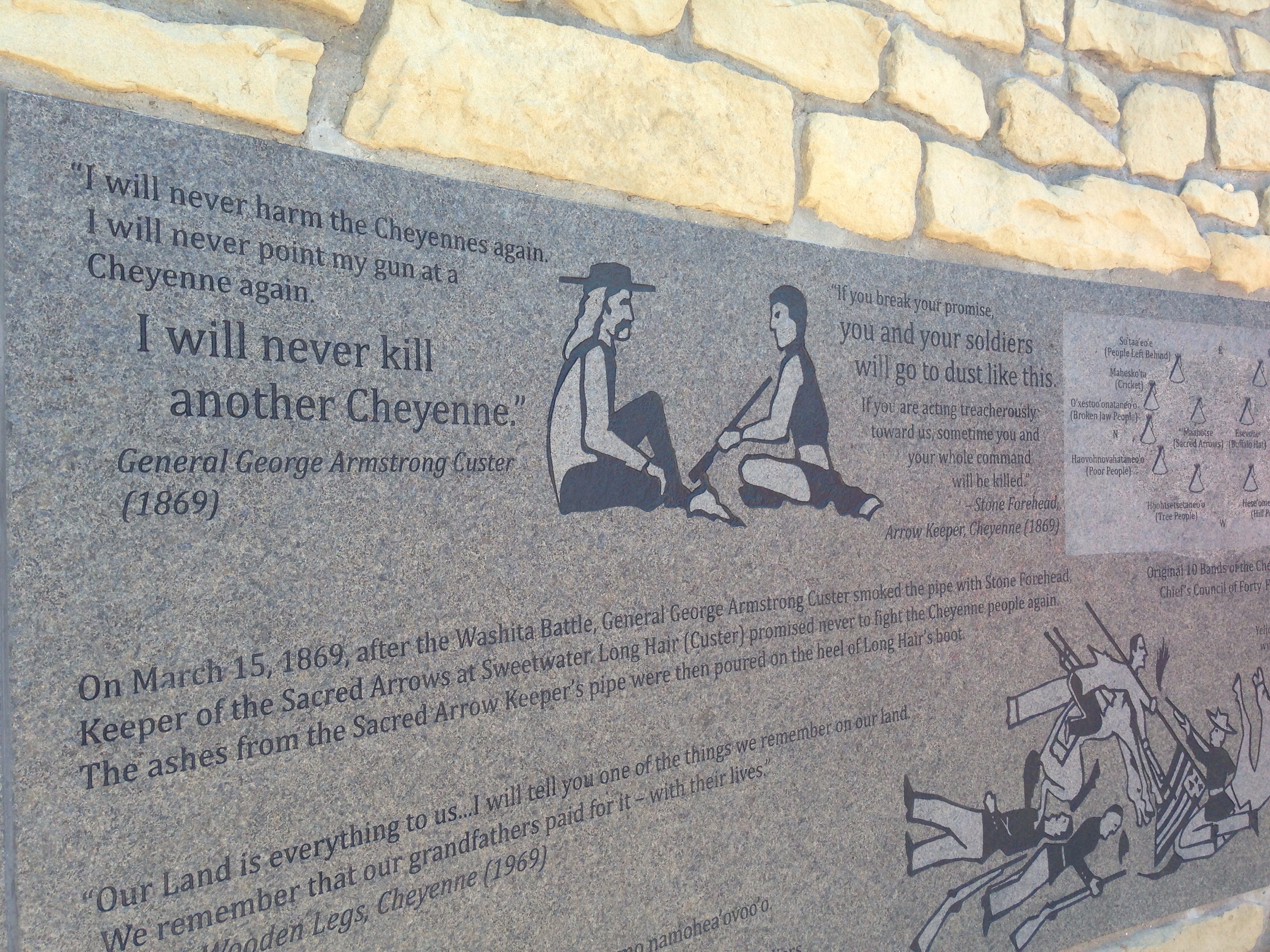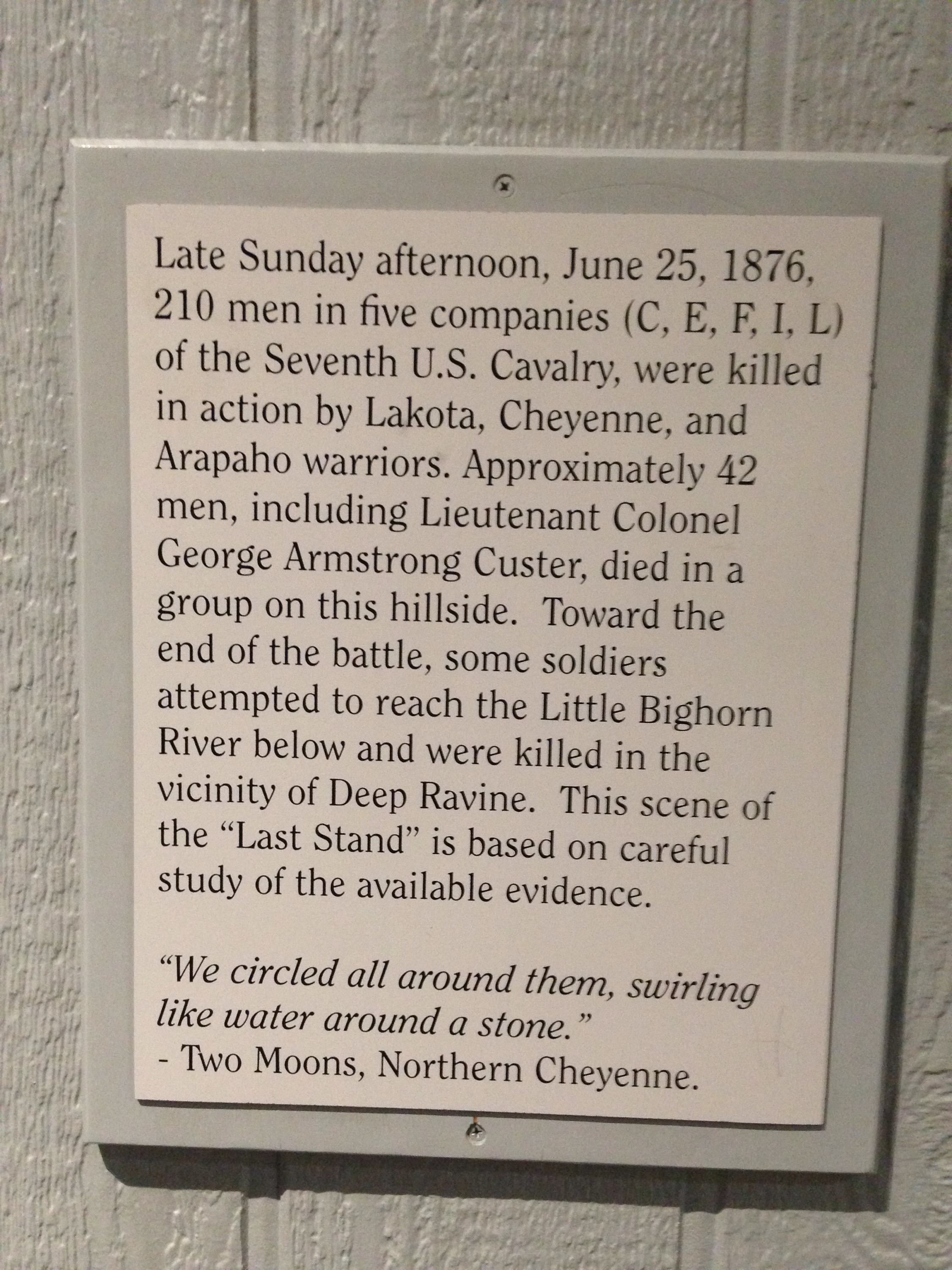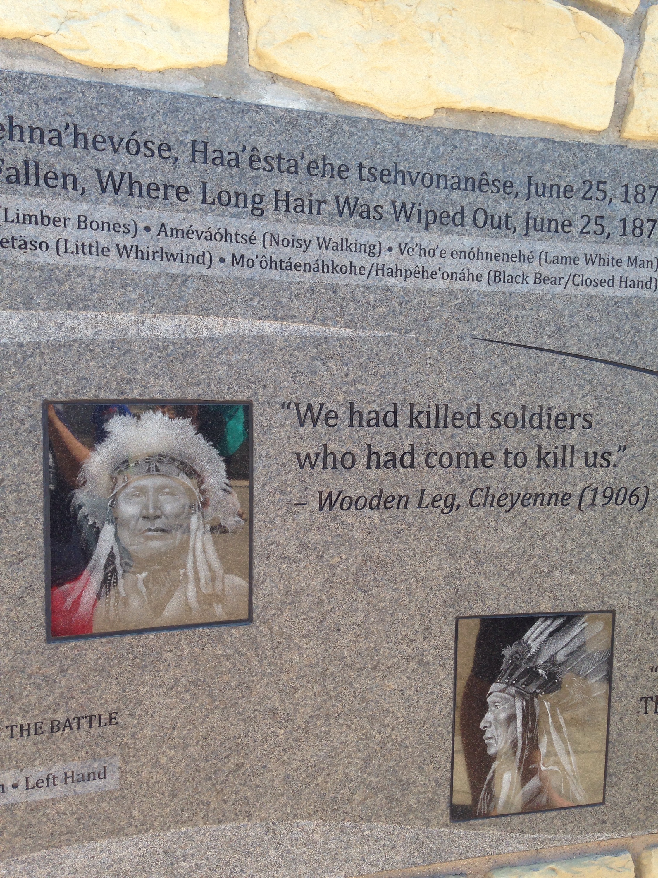 Across from the Memorial to Custer and the US military that died, there is a Native American Memorial. You enter the half circle and there is a iron formed memorial. Around the inside of the memorial there are quotes and pictures from survivors of the battle, as well as from Lakota, Cheyenne and Arapaho Indians.