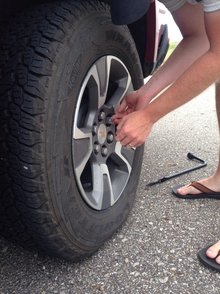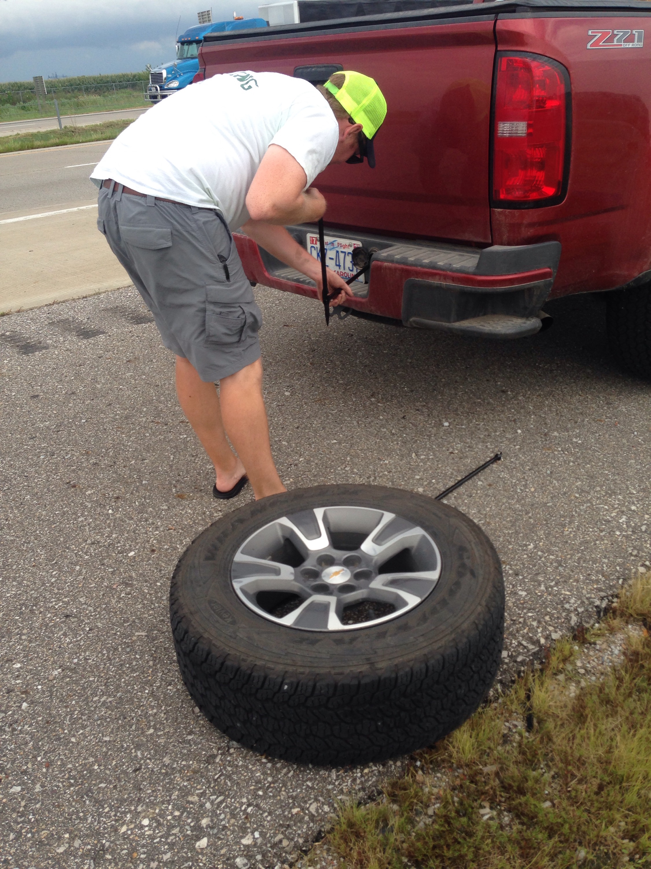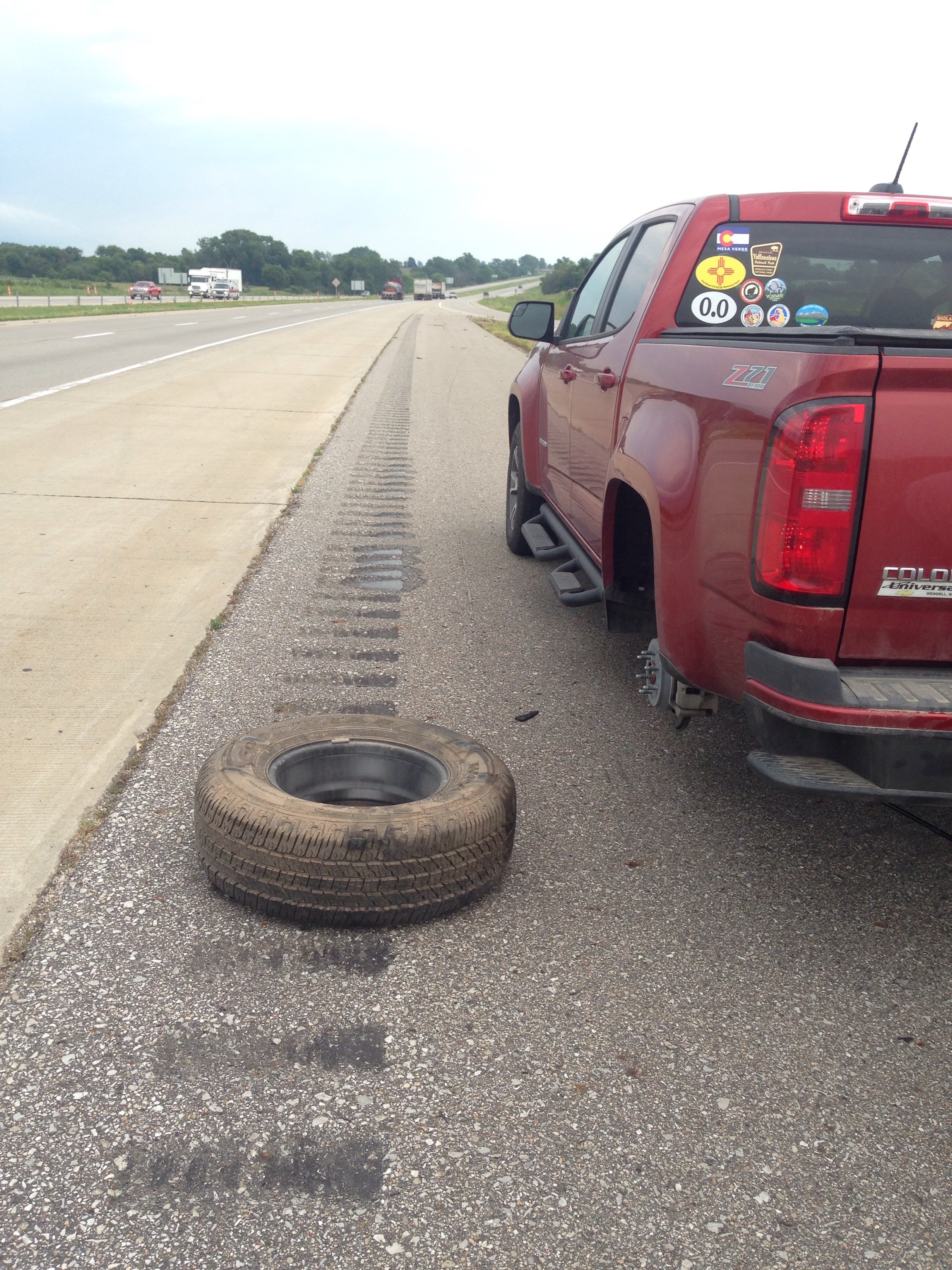 No sooner did we take pictures of the the signs for Altoona as we passed, when the truck rang an alert that the rear driver-side tire PSI was 10..then 6.. and then 0. We pulled over immediately and you could hear the air rushing out of it. We had a flat tire, and not a slow leak from a screw like last time. This was the real deal, the one we have been training for. So we called Triple A, and they said anywhere between “now” and an hour or so. We decided we would start changing it ourselves and see if we could beat triple A before they get here.
