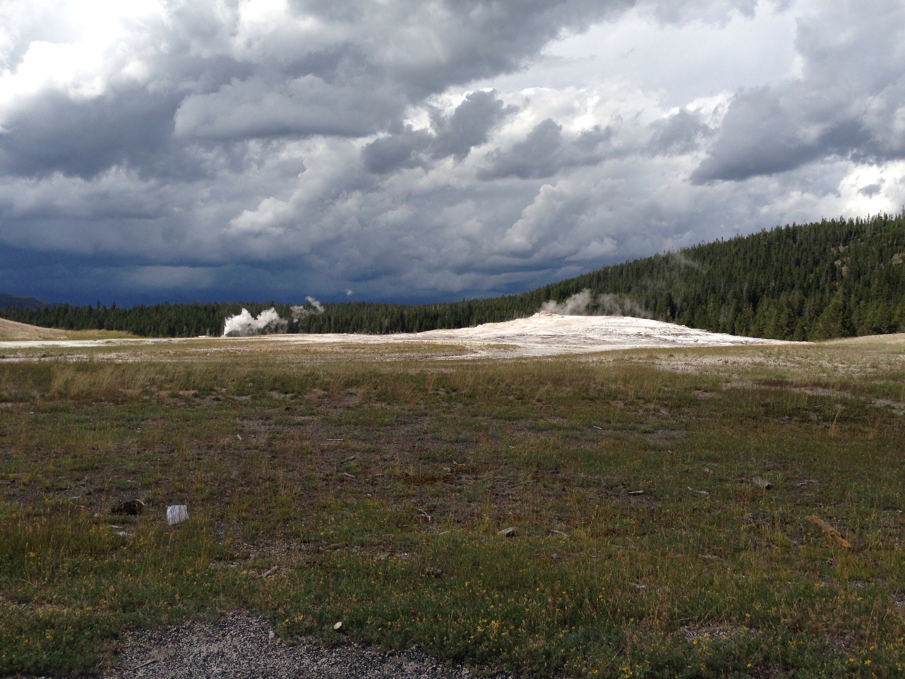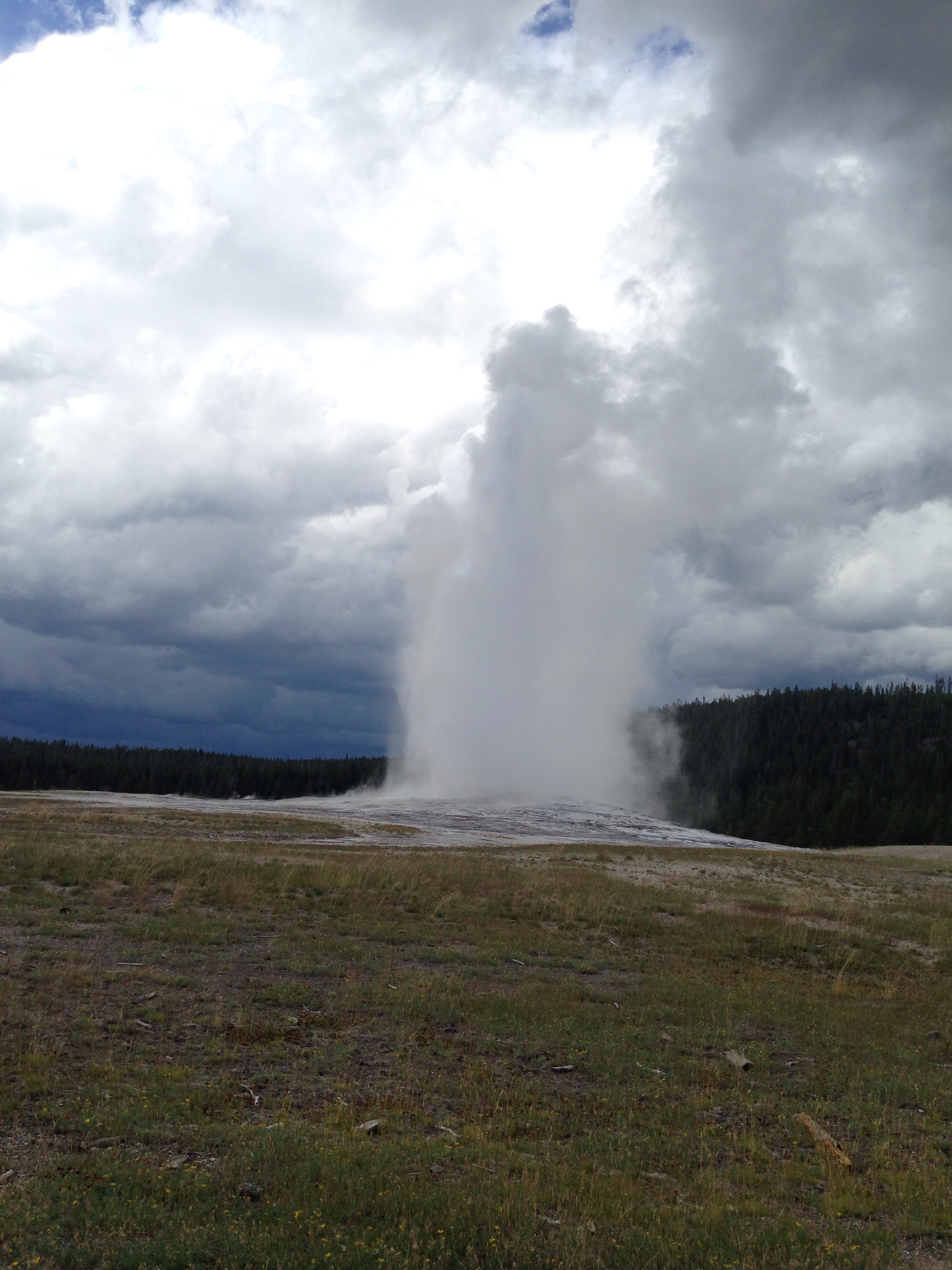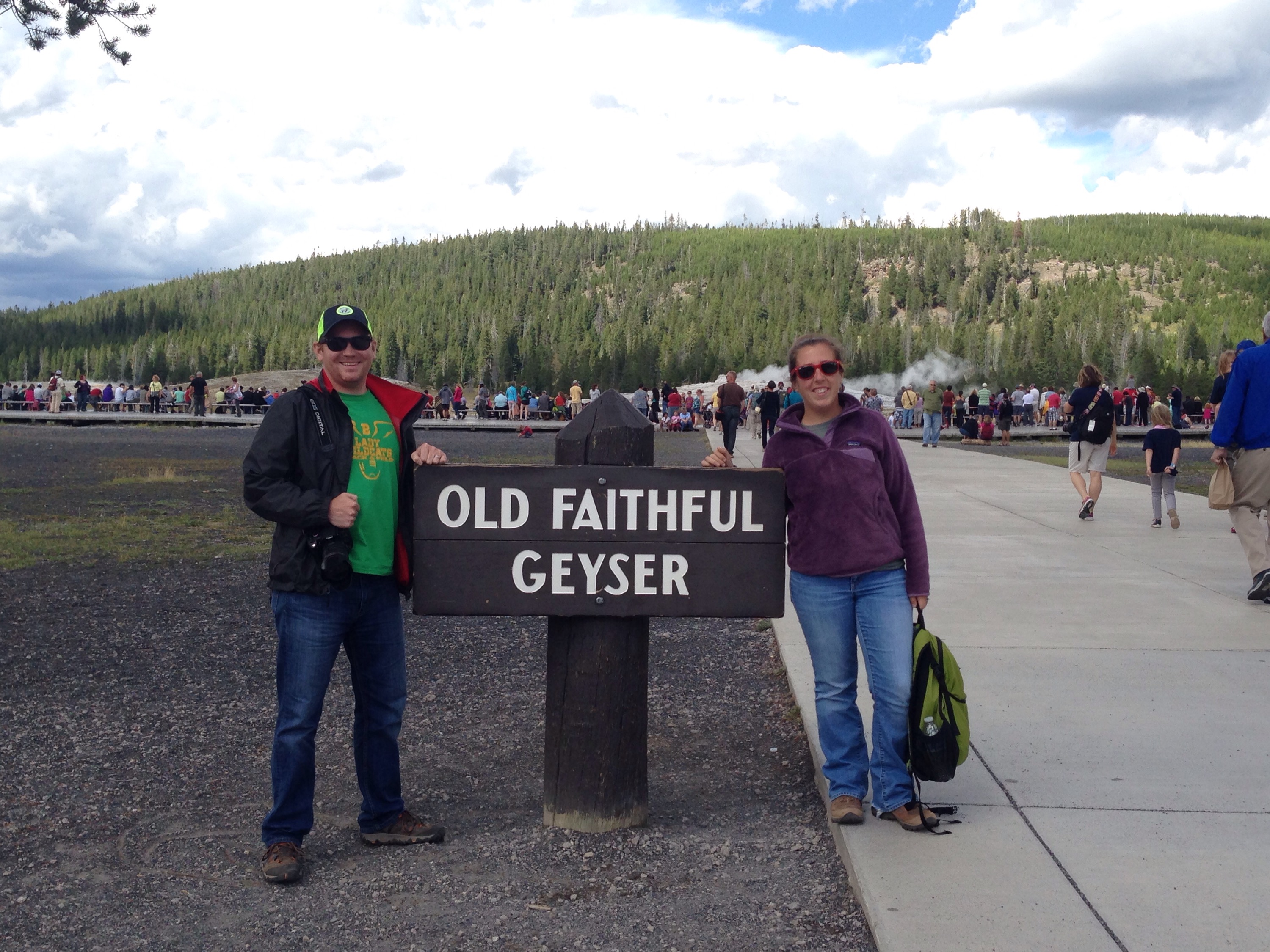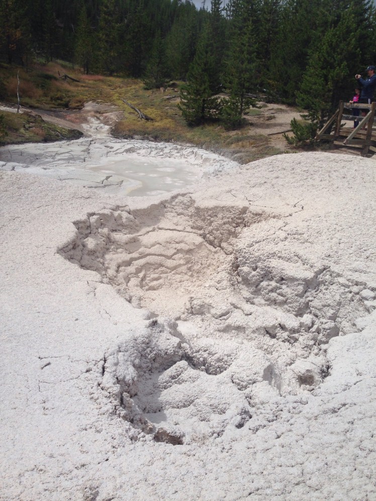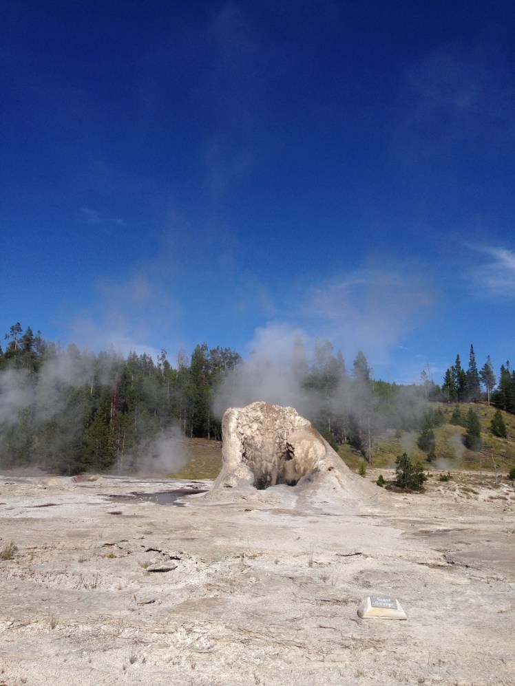 Next we headed over to the iconic Old Faithful. They have a sign with when the next eruption should be, give or take 10 minutes. We were only about 20 minutes away from the next eruption so we got a spot. It was only about 4 or 5 minutes off from the predicted time, but Old Faithful likes to trick you. It bubbles up a little, and then a little more, and then finally the big eruption. It was pretty cool to see it in person, however you just can’t get very close to it.