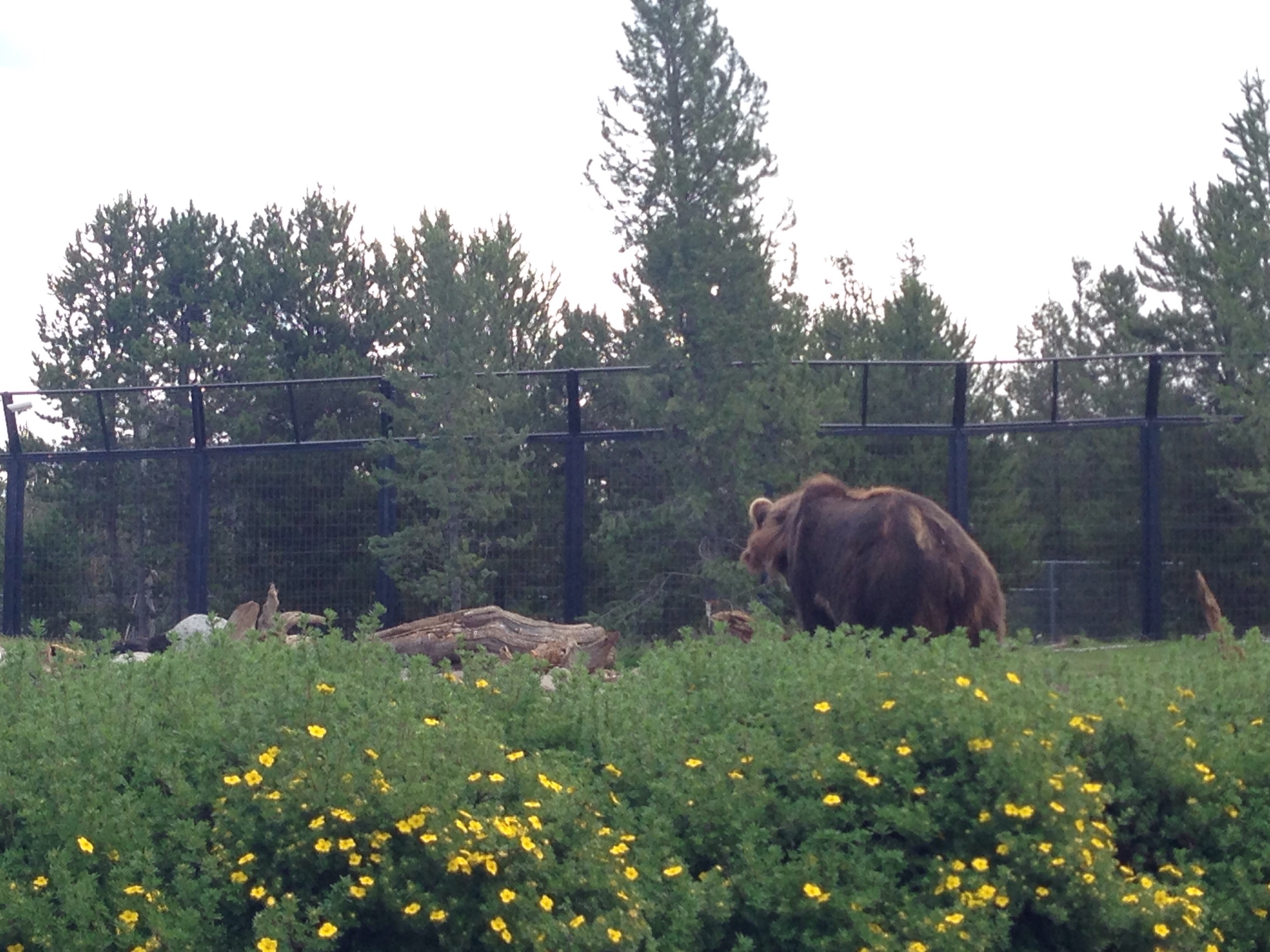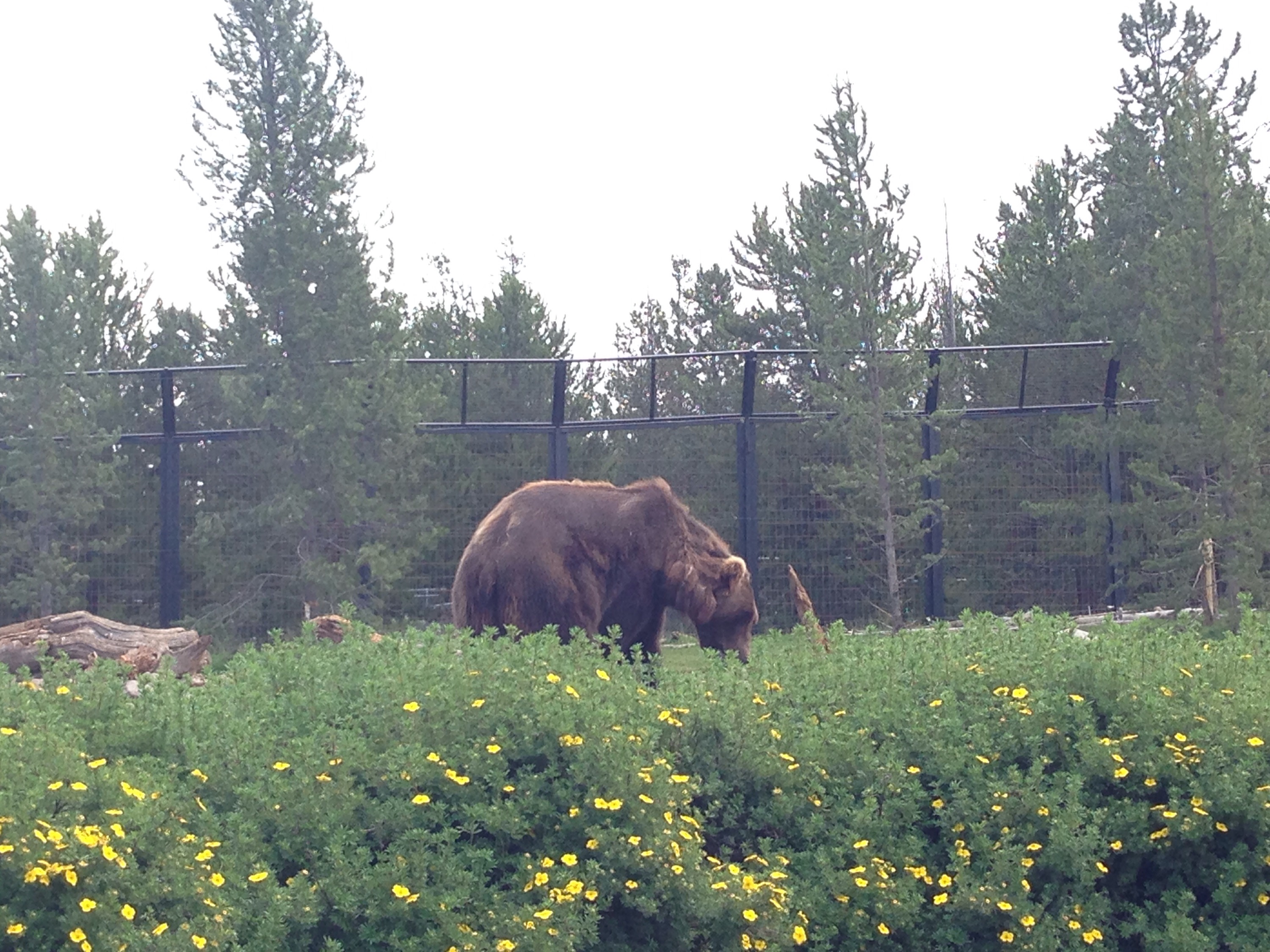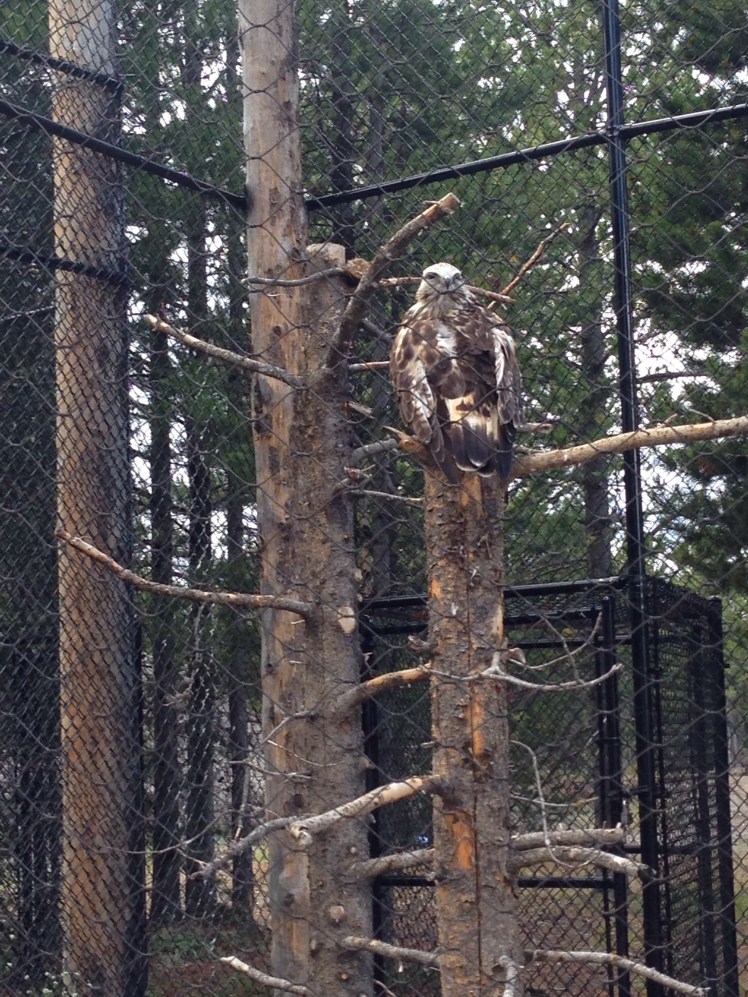We headed out of the West entrance not before we stopped to see another little waterfall. Then we proceeded out of the park into the town of West Yellowstone, MT. We headed there to check out the Grizzly & Wolf Discovery Center. This place has wolves, bears, and raptors that were injured or for some reason can no longer survive in the wild. It was not a zoo, you could tell that this was more of a refuge for these animals. They have two packs of wolves and a center staging area where they let bears out on a rotating basis. While we were there we got to see “Sam” a 1,000 pound bear. He was huge and his ears were adorable.