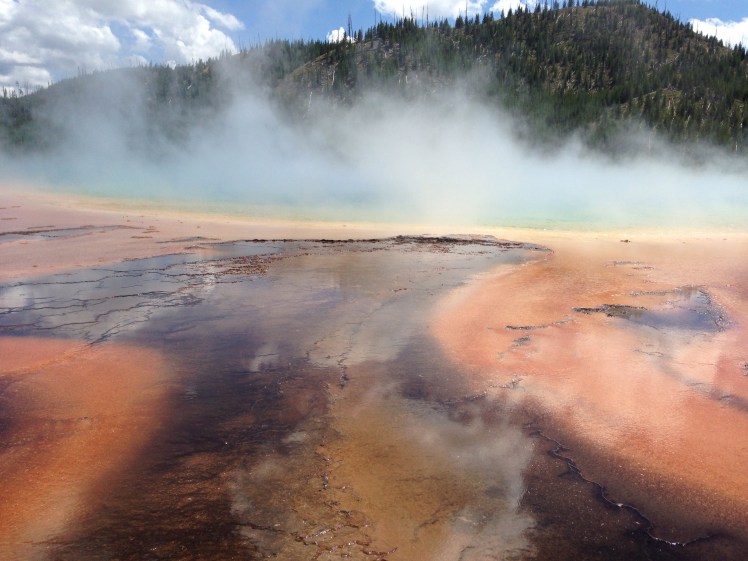 Back to Yellowstone we went to continue our hot spring and geyser tour. We headed to the Midway geyser basin. This is where the Grand Prismatic is. It is a huge hot spring/pool that has just amazing colors, lots of steam, and expands so far. You often see this on postcards and prints. The only down size is you really just get to see it eye level, but you can walk all around it and the surrounding area. It was also cool to see bison footprints in the area. This water and bacteria is way too harmful for humans, yet the animals don’t seem to mind it!