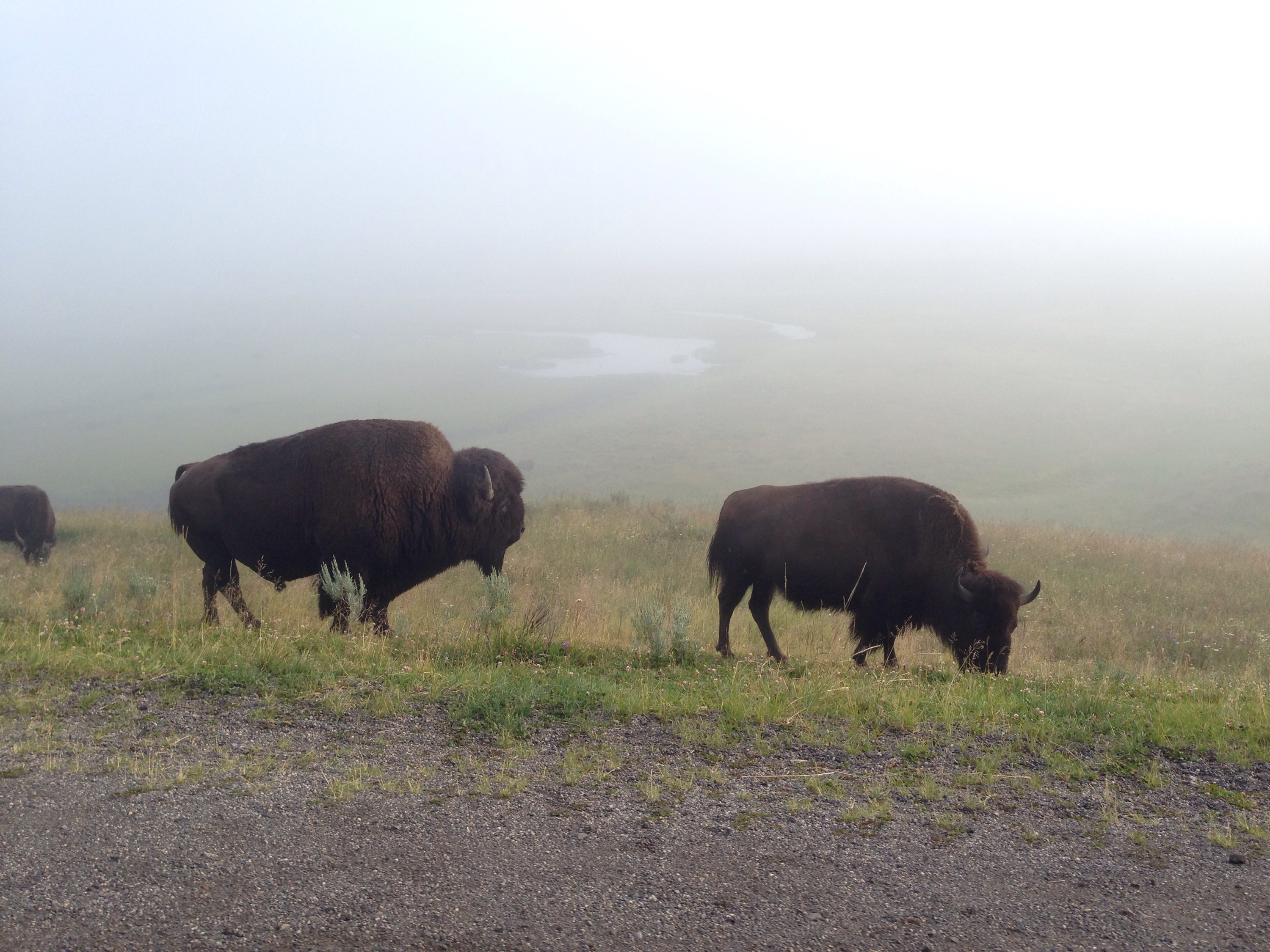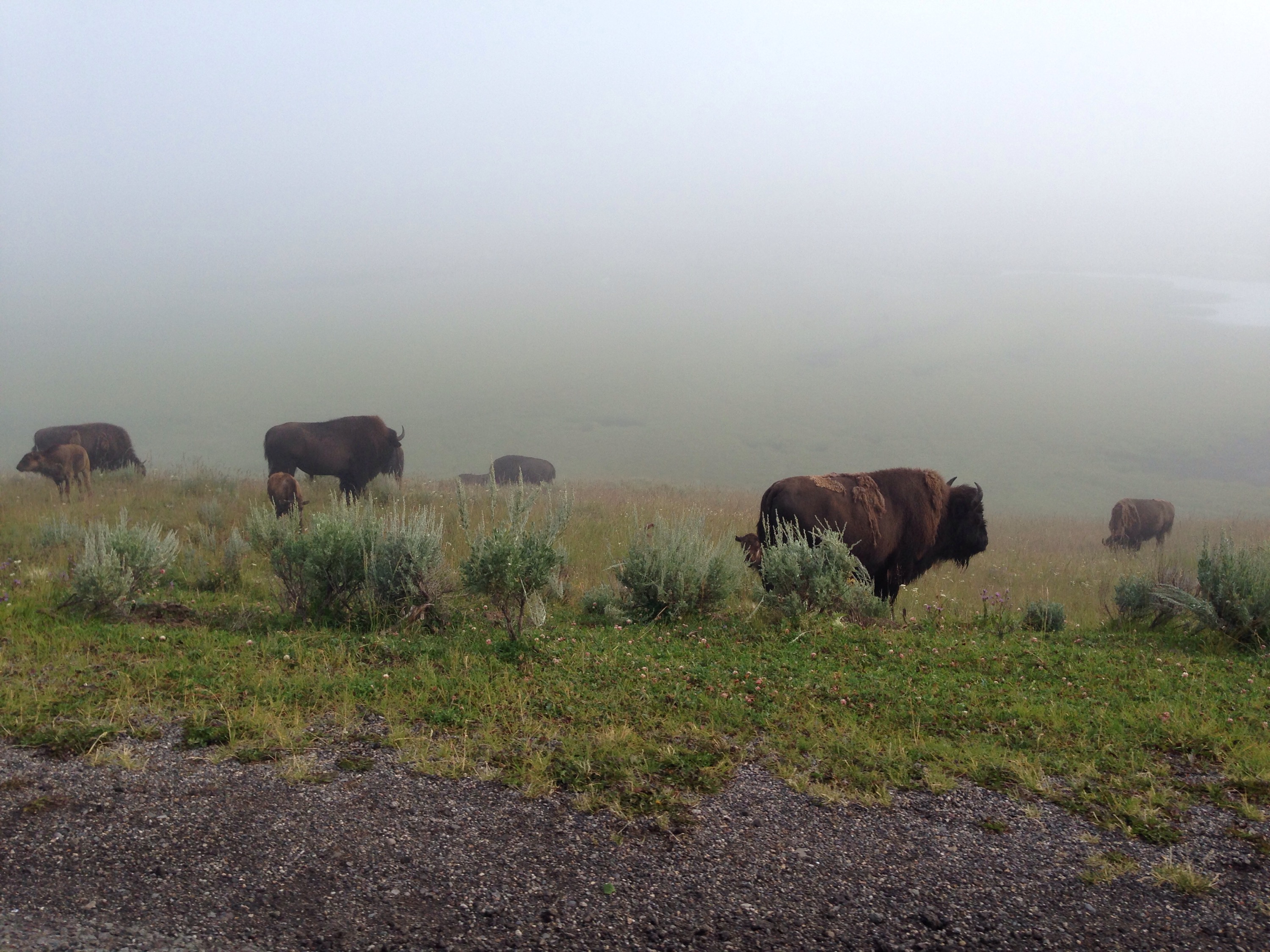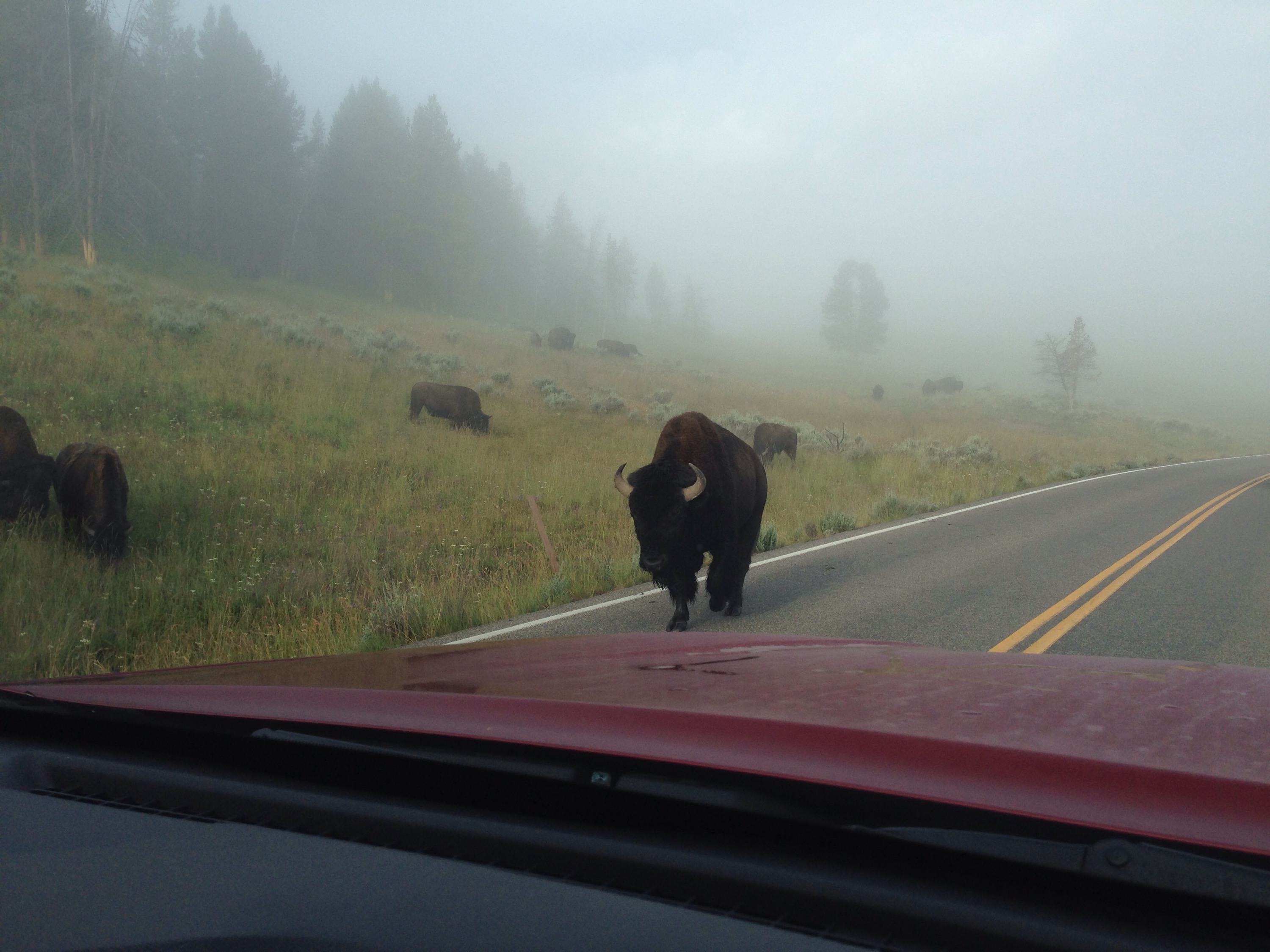 The first thing we did was drive up to Canyon to meet her for breakfast on Thursday. On there way there (and several other times throughout our stay in Yellowstone) we got caught in a Bison jam they walk along and into the road way. And they are not moving! You have to respect how huge and powerful they are, yet they are cute! Danielle got giddy every time we saw one, especially when they were close to the car.