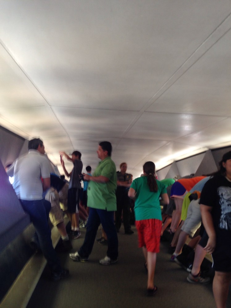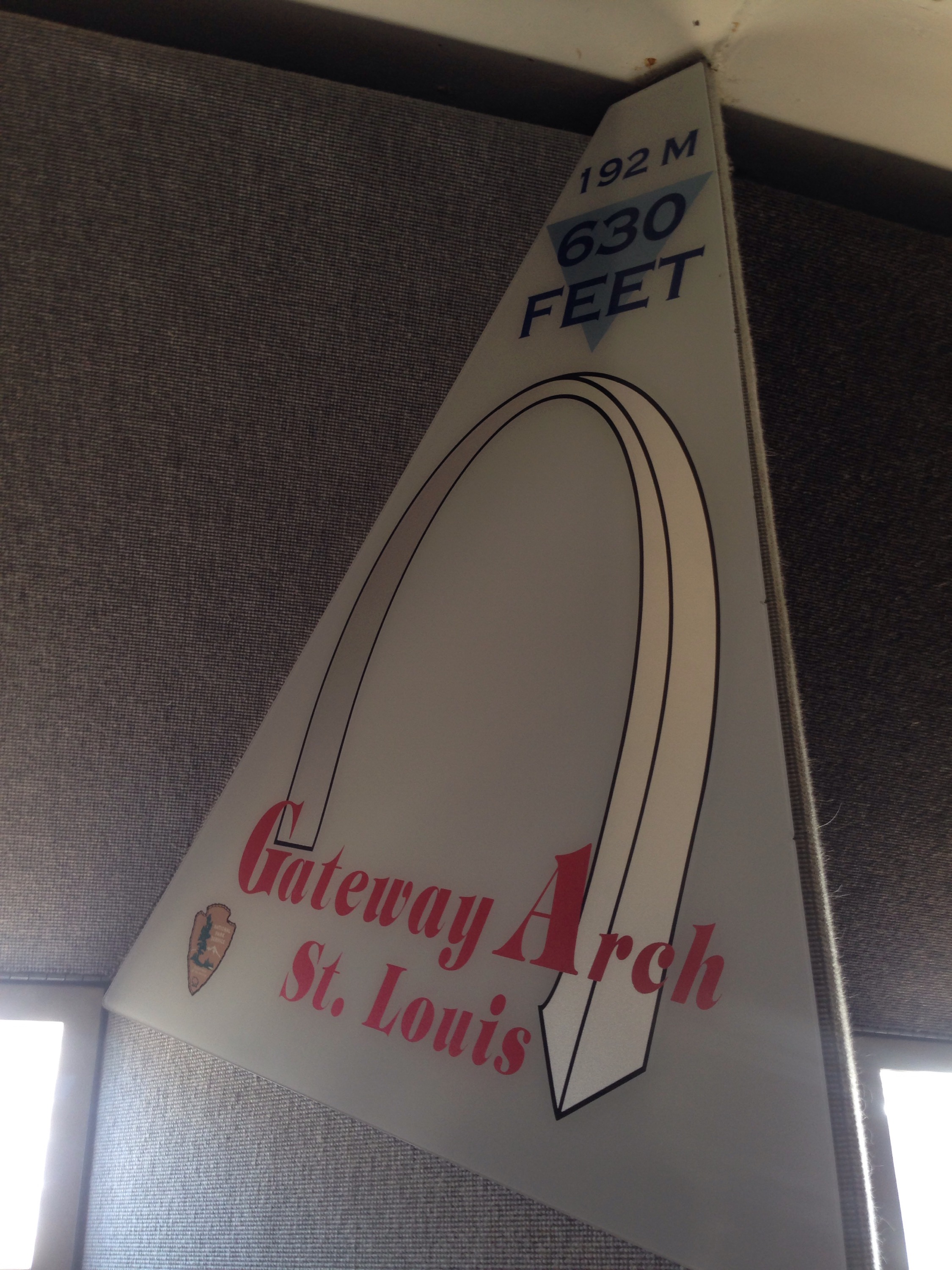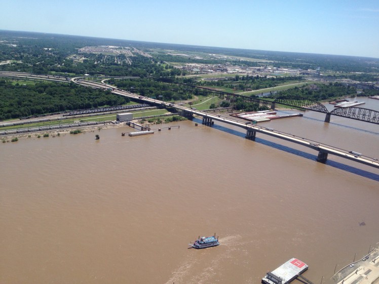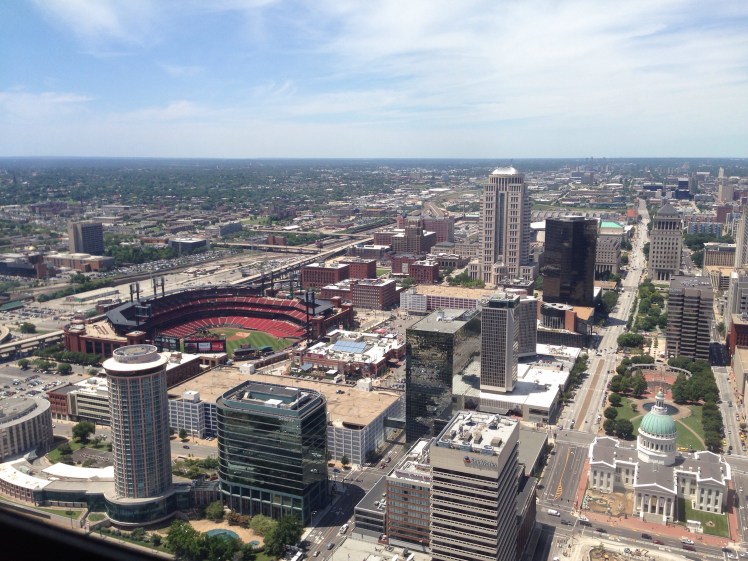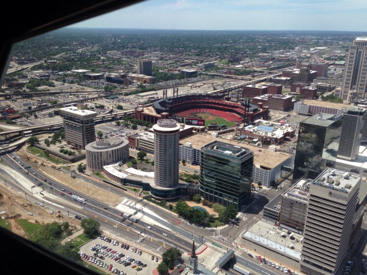 But once you get to the top you are at the very top of the arch and can walk pretty much the length of it. The observation sights are like little slits and you have to lean over to see out of them. It was narrow and crowded, so we didn’t hang out too long. But there are some awesome views of St. Louis, the Mississippi River, and the Cardinals stadium.