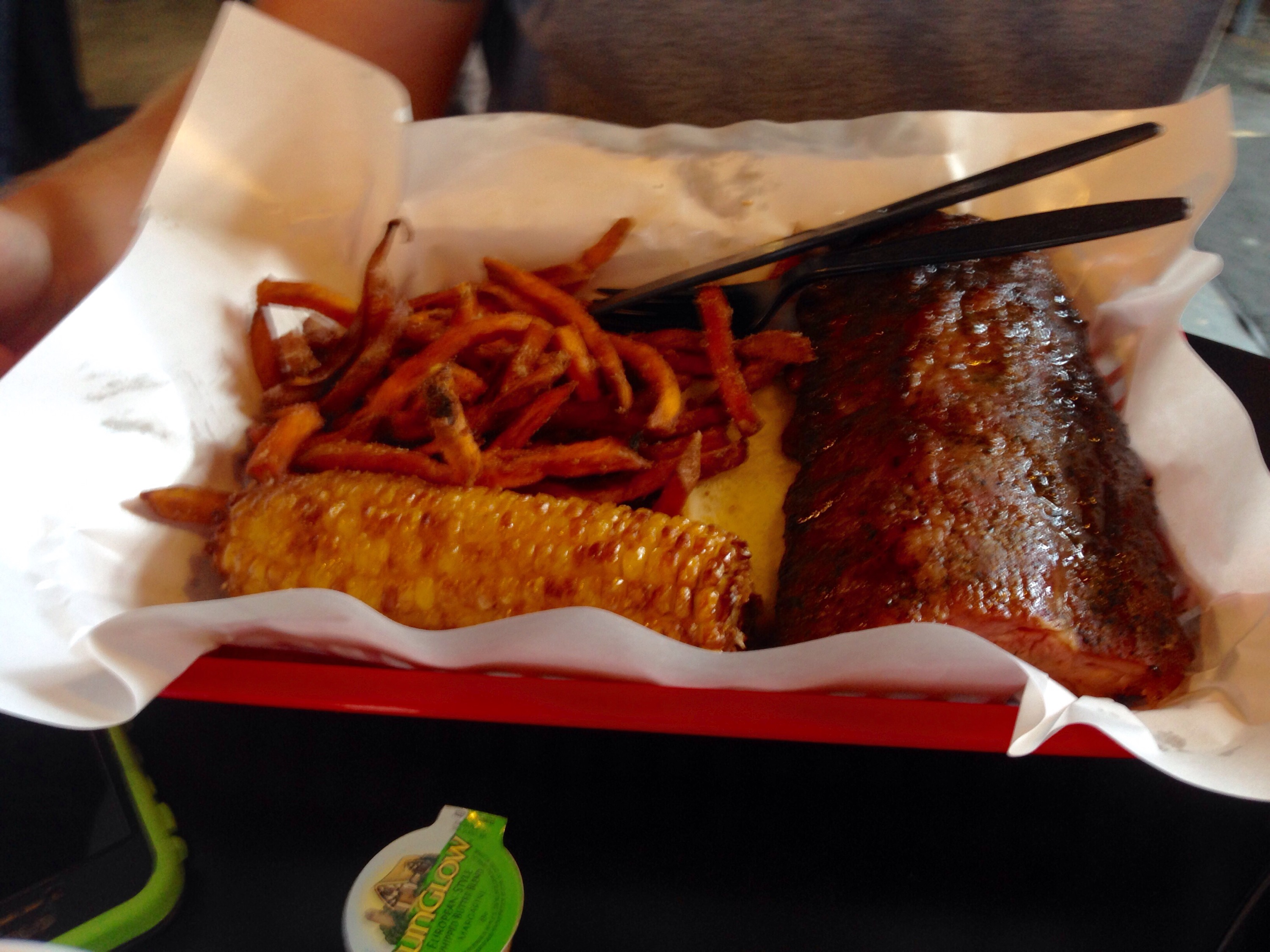 We ordered Pulled Chicken (beans and vinegar slaw) and Ribs (Sweet potato fries and fried corn on the cob). At each table they had 4 different types of bbq/ hot sauce. The food was defiantly worth the wait and there was nothing left on our plates.
