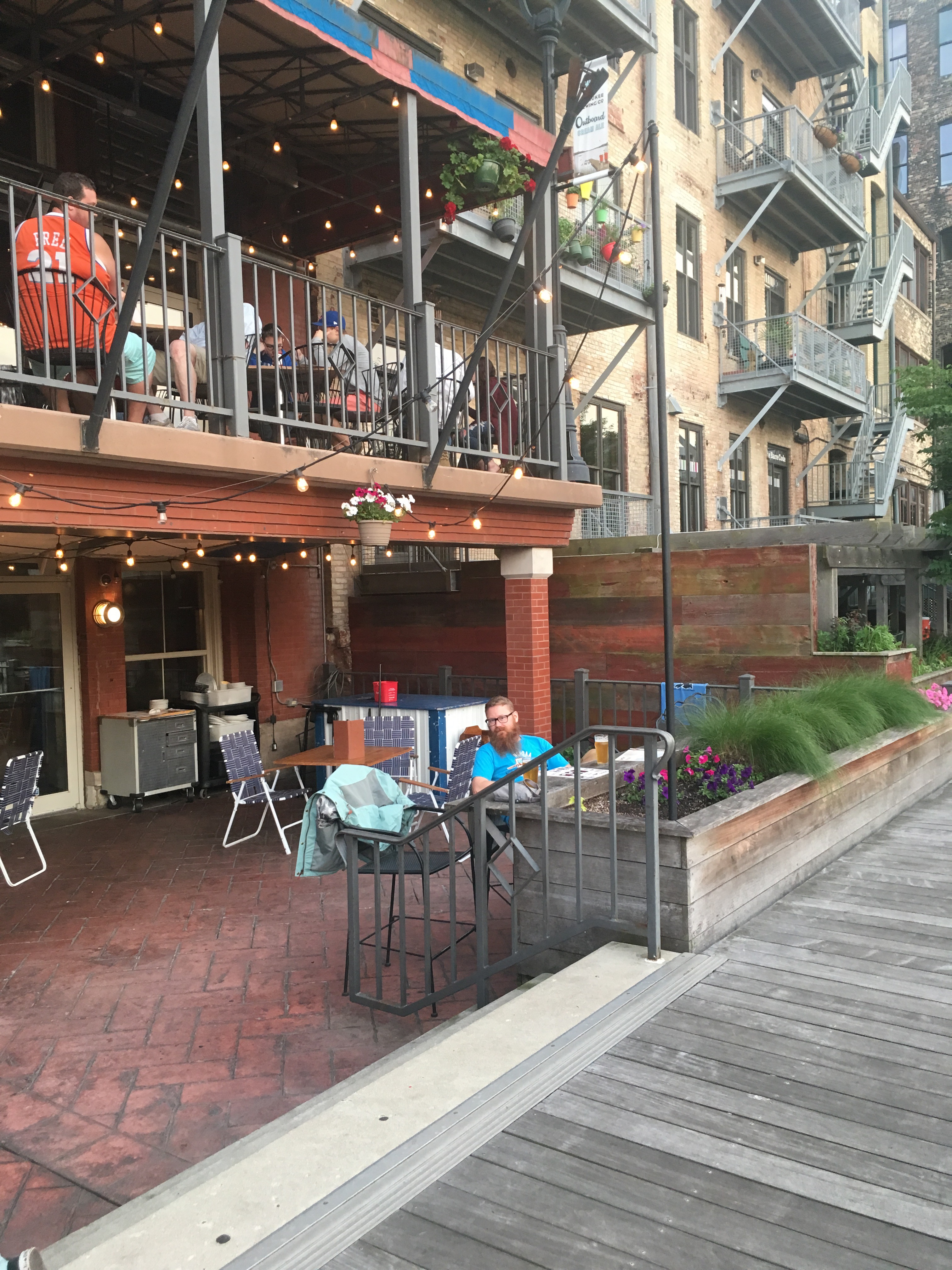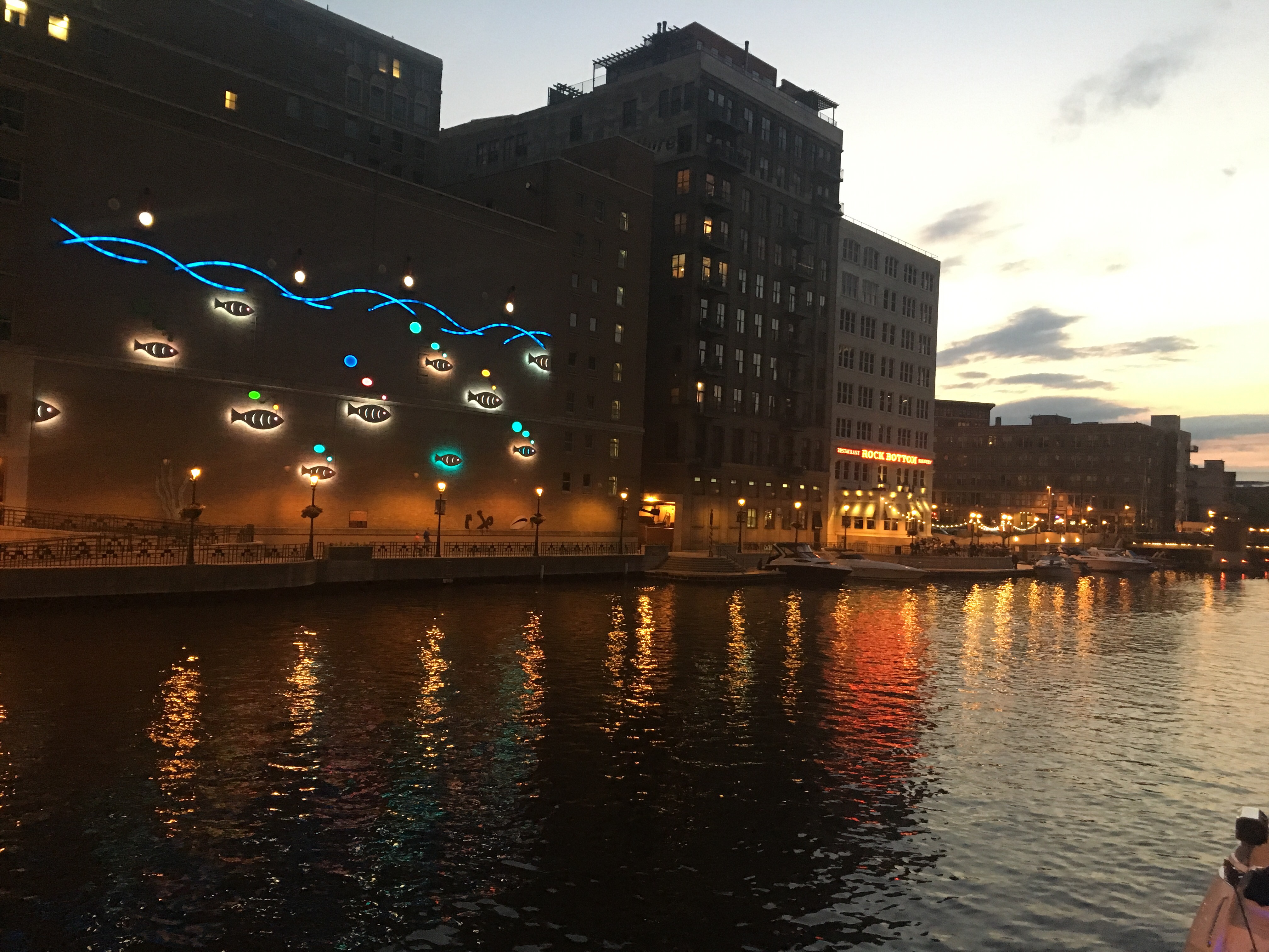 After dinner we walked along with River Walk boardwalk area. It’s a really nice pedestrian walkway that follows the Milwaukee river and leads you into the Historic Third Ward area. We planned to check out the Public Market but it was closed so we snapped a nice picture from the outside. Back on the river walk, we found the Milwaukee Brewing Company. We got to sit right outside and watch the party paddle boats float by. (side note: if about 10 people want to come back to Milwaukee with us sometime, we are totally going to rent out one of these party paddle boats. What better mode of transportation for a pub crawl than a paddle boat bar?!)