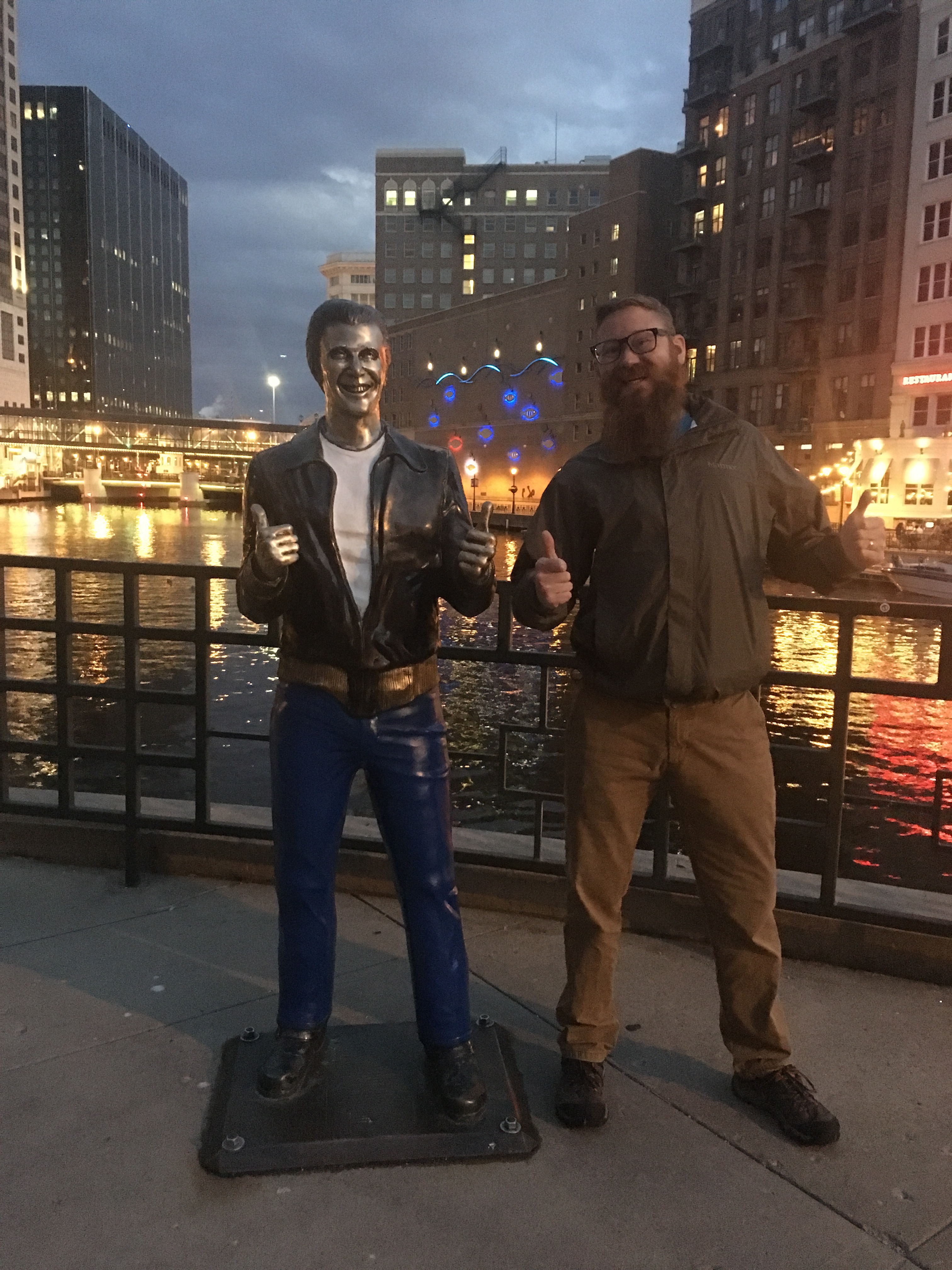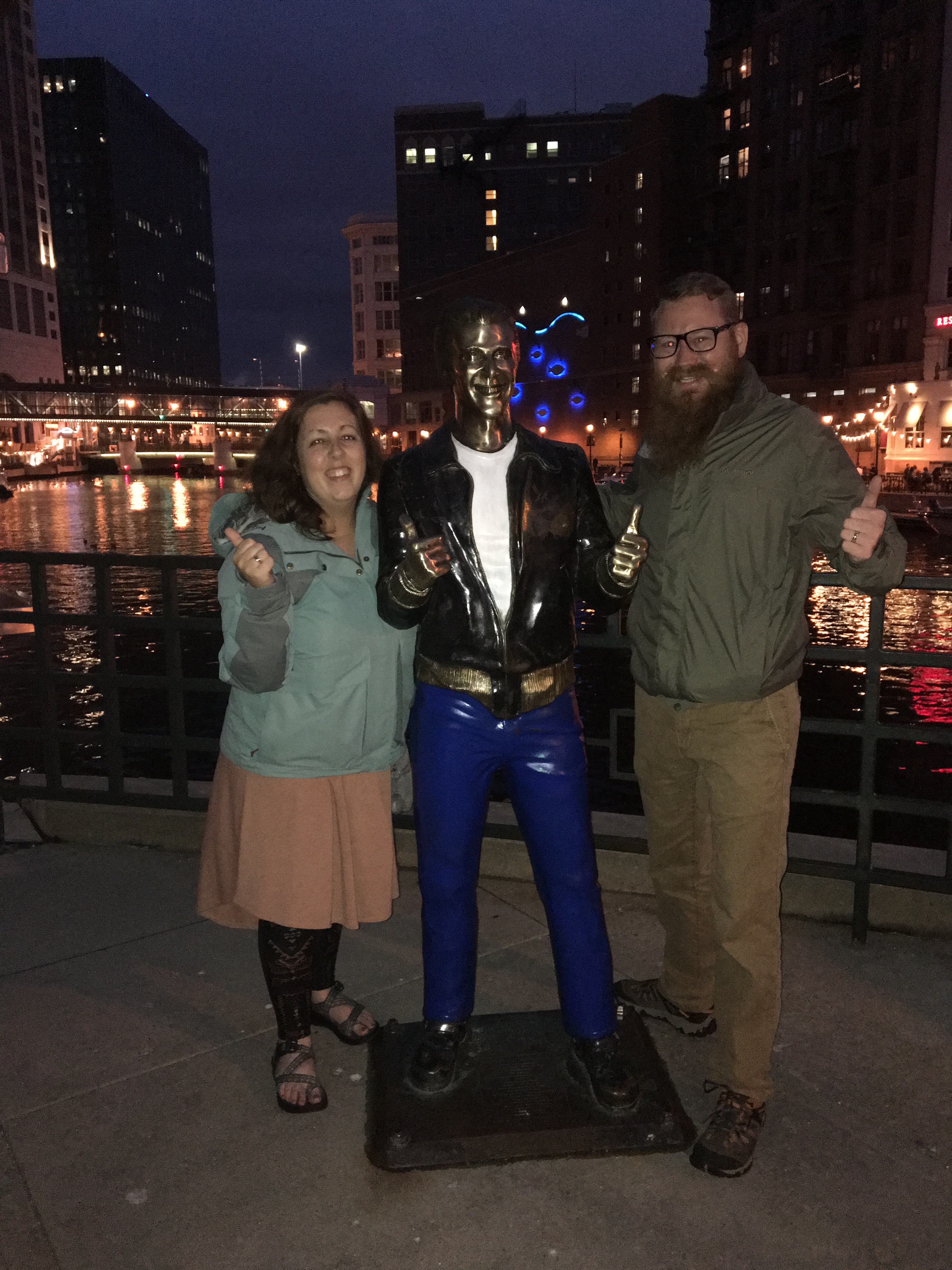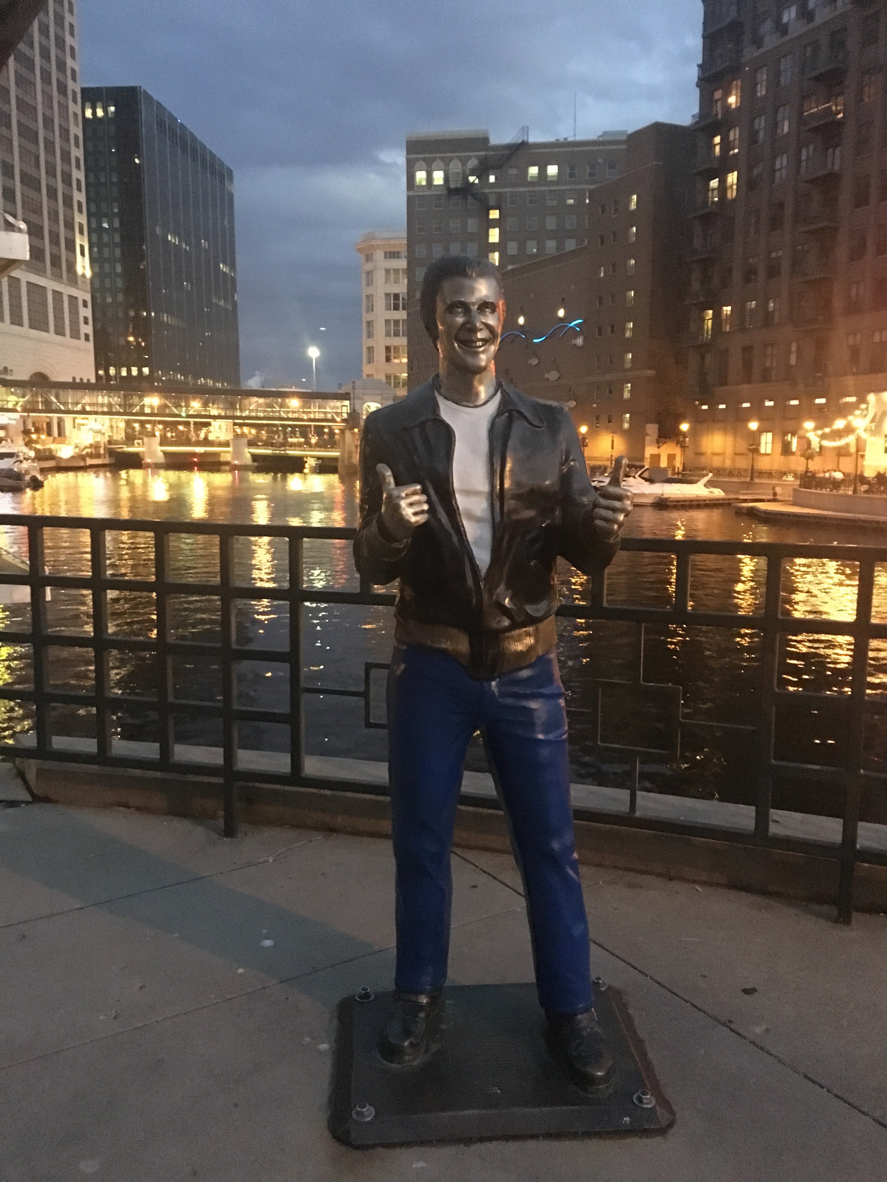 We got back on the river walk and walked to the other end of the River Walk as the sun started to set. They have sculptures and statues along the river walk, as well as some light displays. The best by far was the bronz Fonz statue! (yes, Henry Winkler) Ayyyyyy!