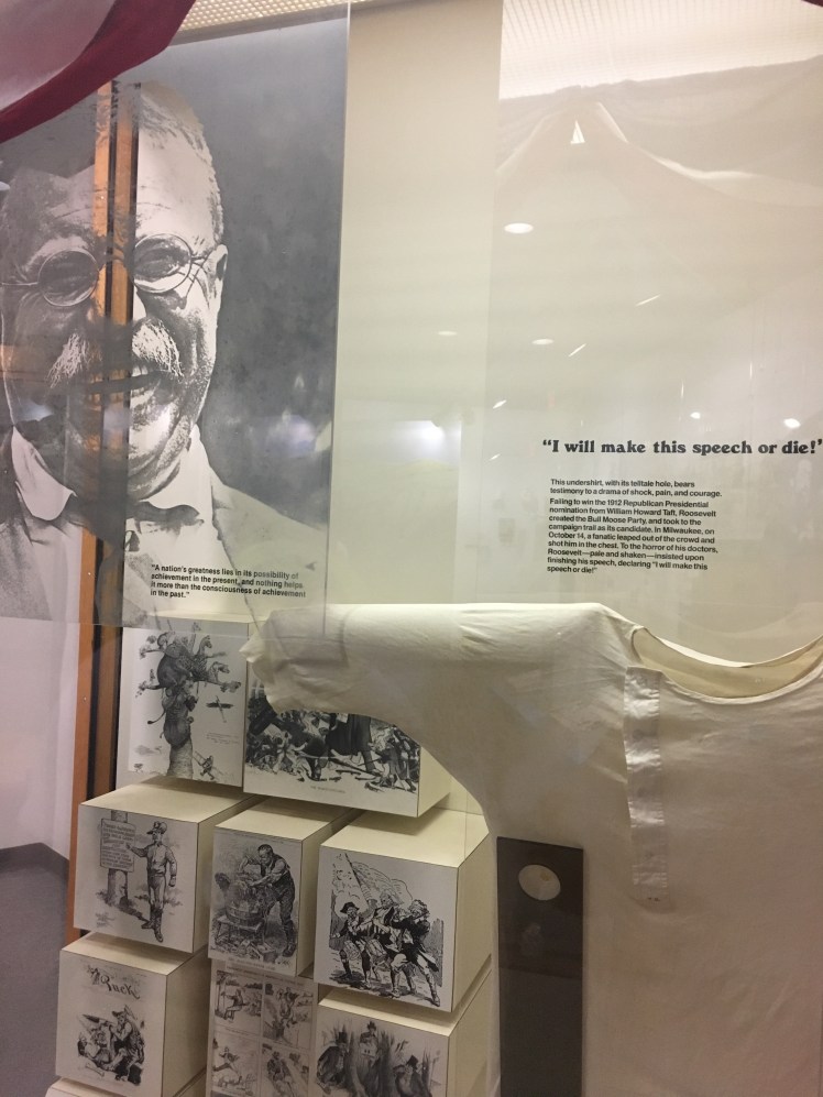 Upon entry into the South Unit, the visitor center is immediately on your left. We stopped there, watched the movie, and toured the small exhibit they had. It focused on wildlife in the badlands, as well as TR. We both squealed with excitement when we saw the shirt TR was wearing when he was shot delivering a campaign speech. (The dude got shot, acknowledged the gun wound, but kept on speaking before seeking any medical attention).