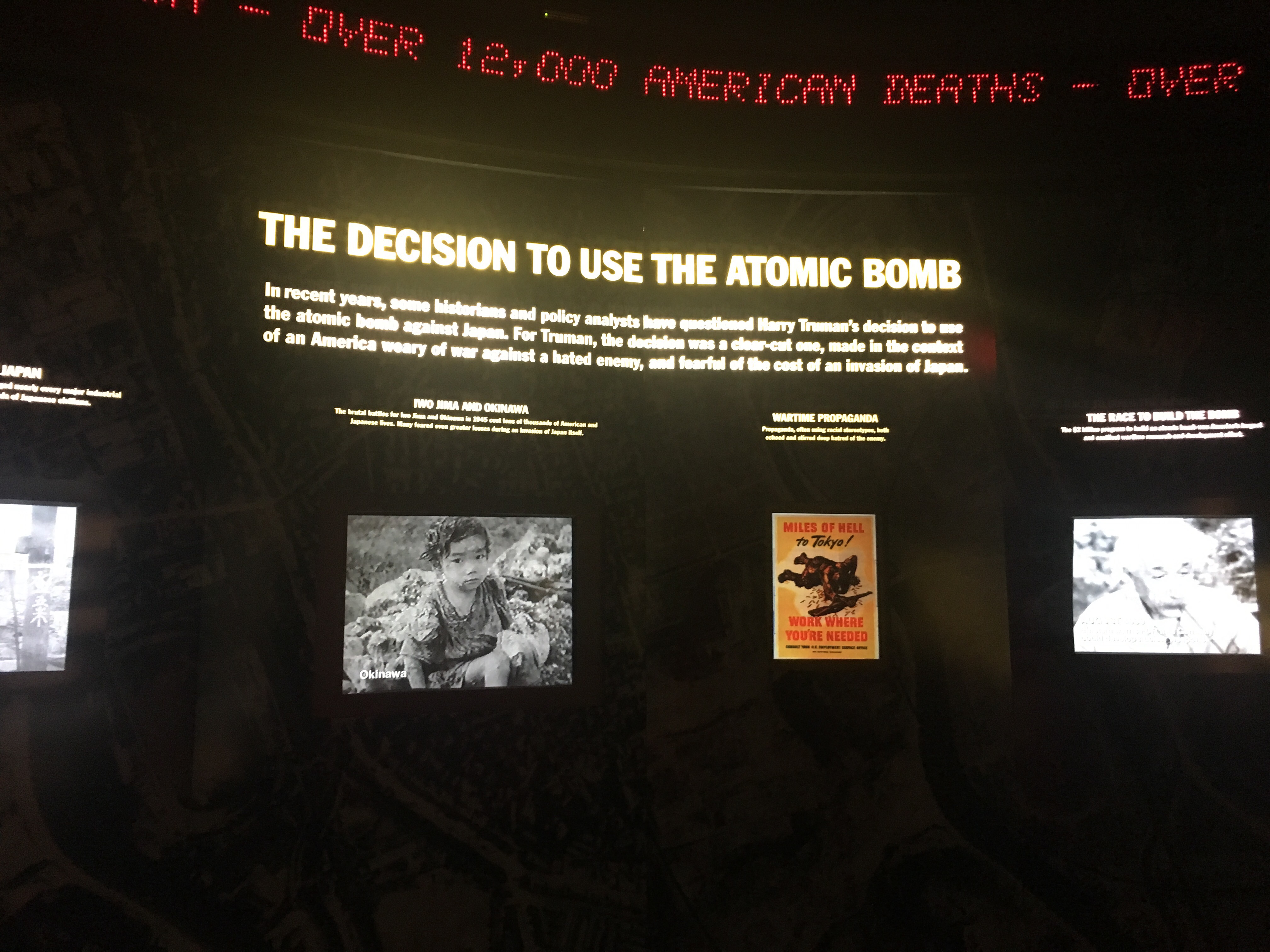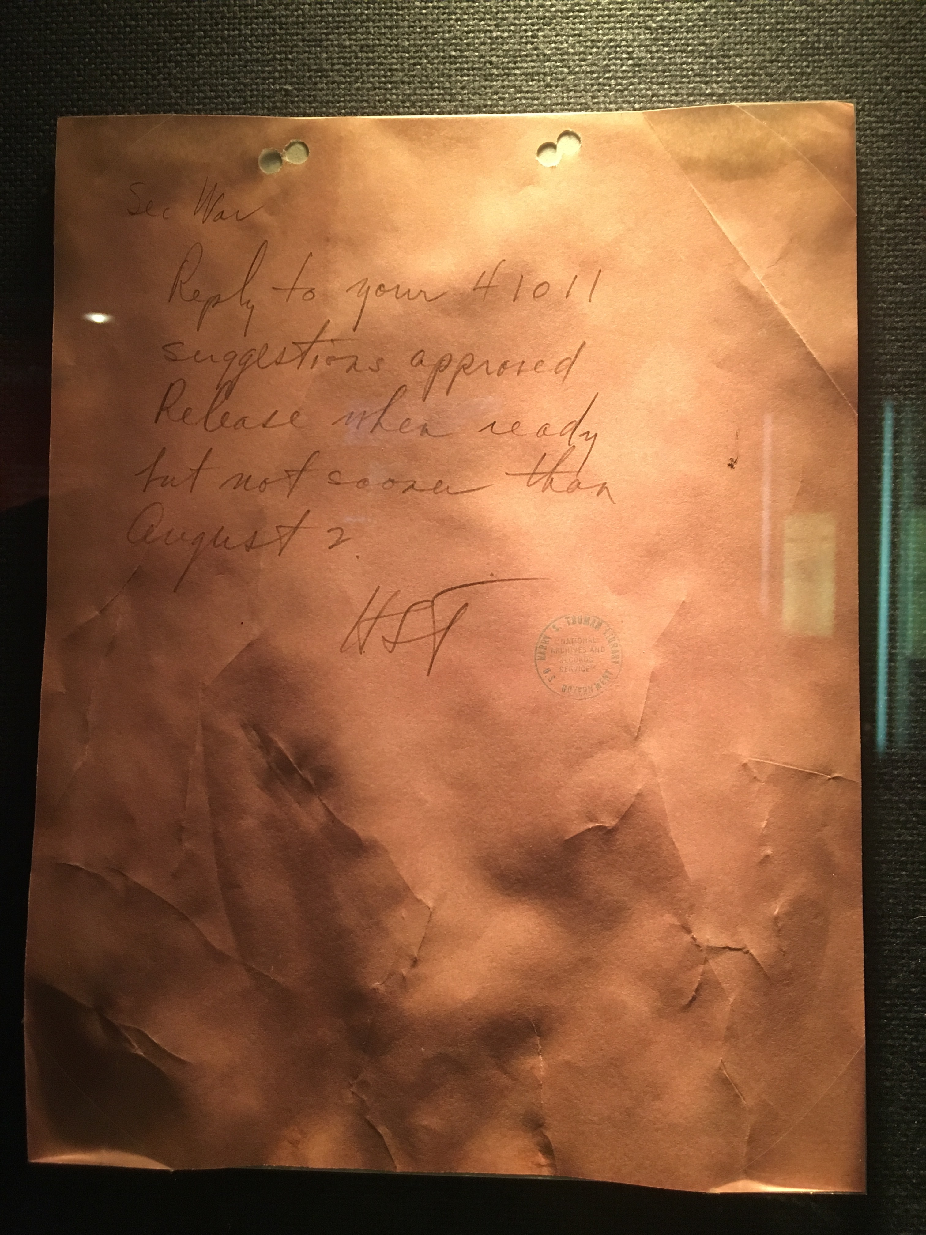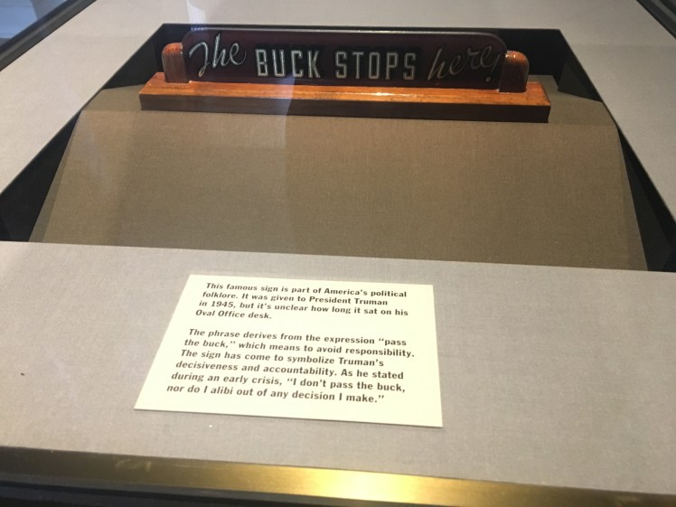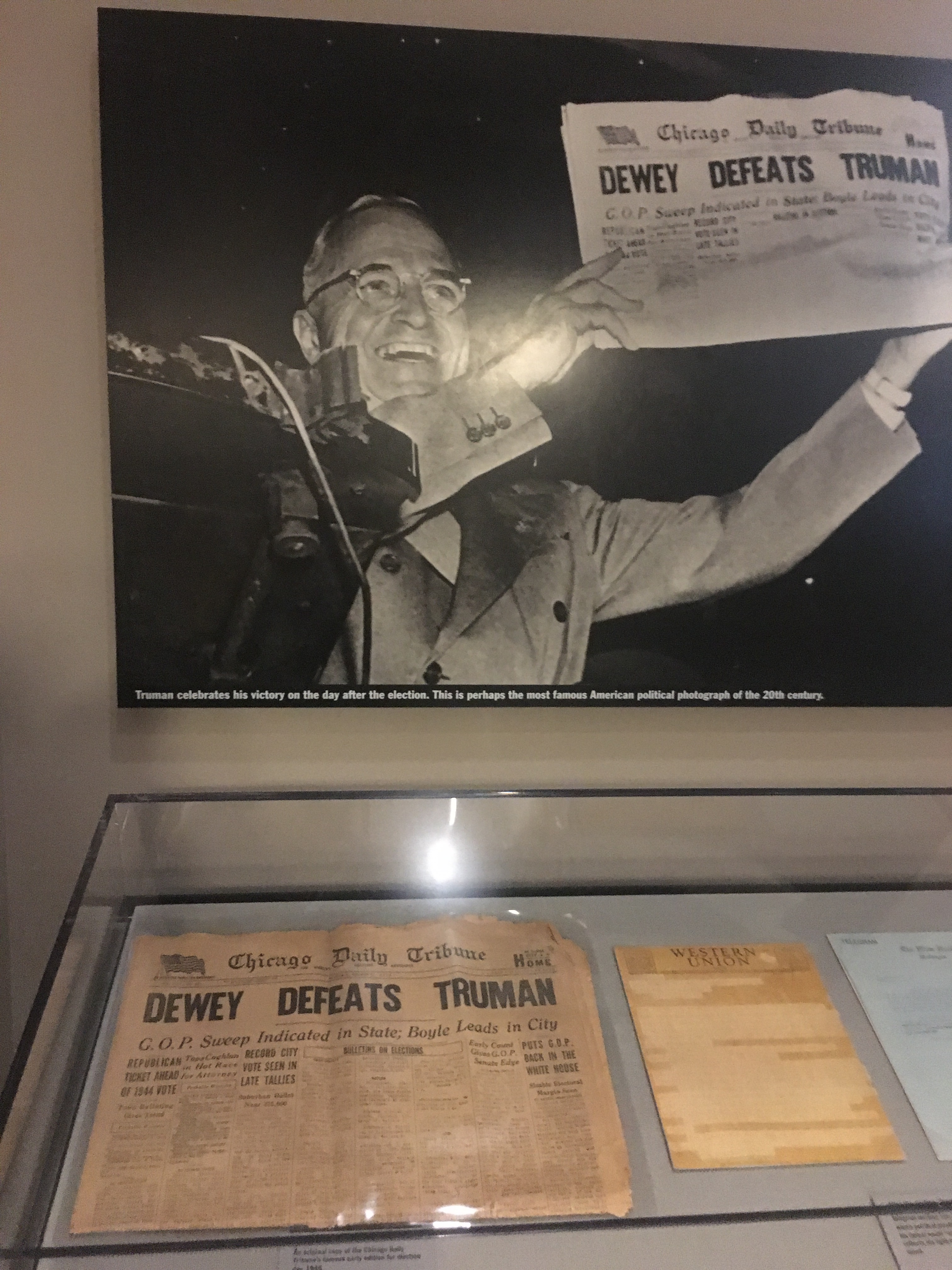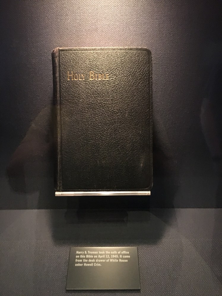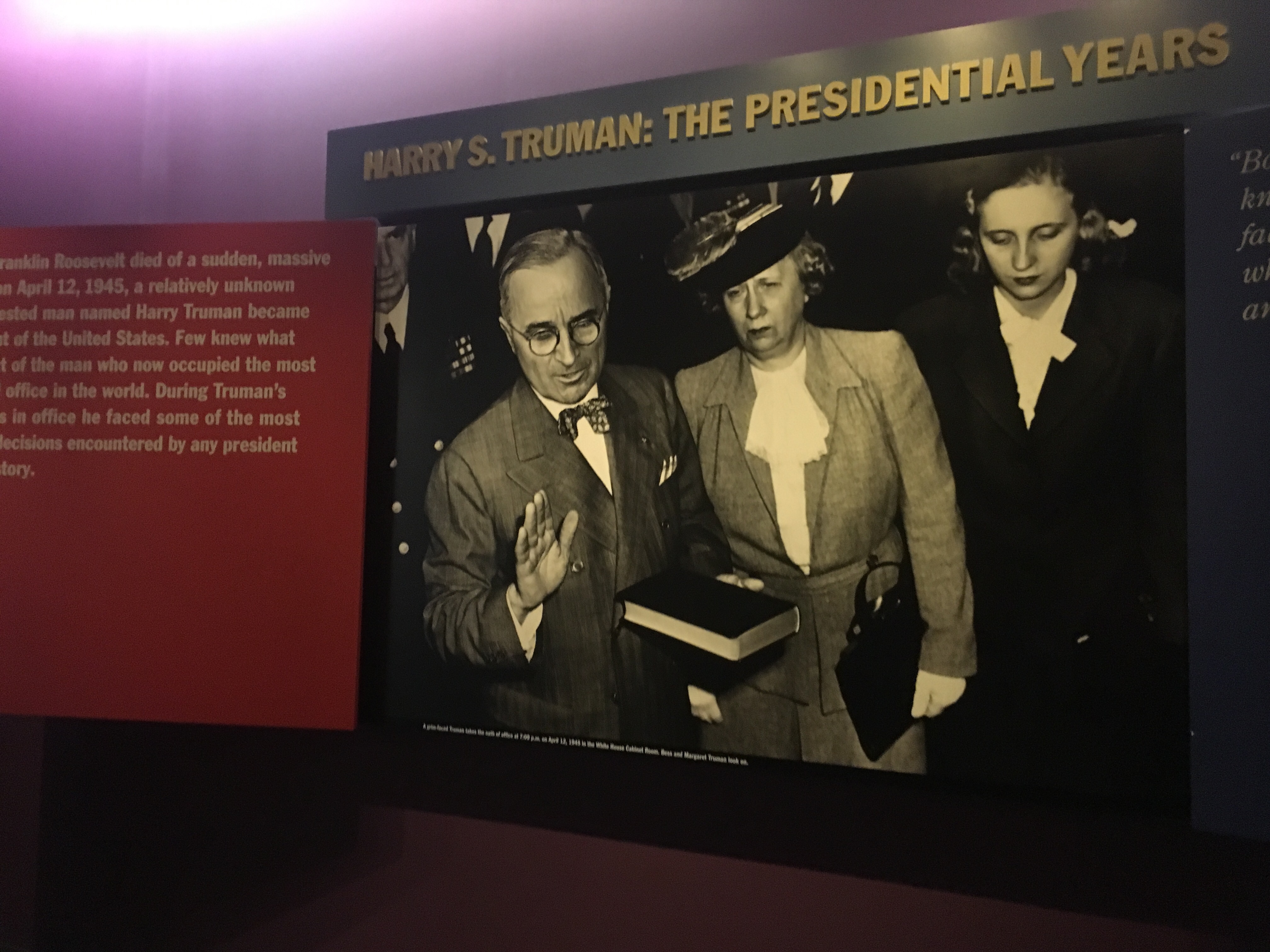 The museum was loaded with great artifacts. Our favorite were: “The Buck Stops here” desk sign, the Bible he took the oath on after FDR died suddenly, the only written acknowledgement of Truman’s decision to use atomic weapons on Japan, and a copy of the misprinted newspaper misstating Truman’s lost to Dewey.