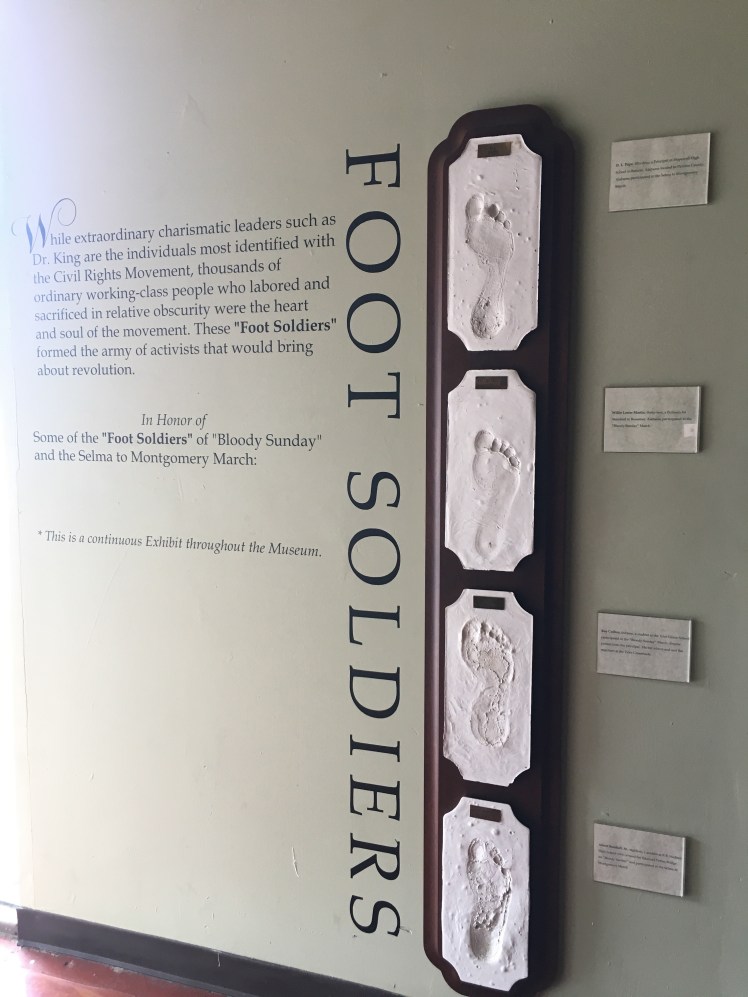 An on going exhibit throughout the museum are plaster casts of foot prints of many of the “foot soldiers” that marched from Selma to Montgomery. While we know the names of the leaders, to see the names and stories of the foot soldiers was just as powerful. Every day people, making the difference!