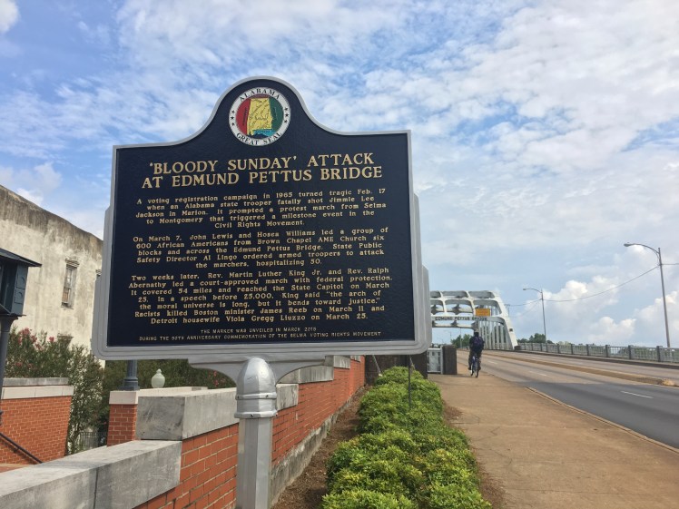We headed south to Selma, AL to begin the Selma to Montgomery freedom trail. Here we drove across and then walked over the Edmund Pettus Bridge. In memorial of Jimmy Jackson, a young man that was shot and killed in 1963 during a voter registration campaign, peaceful protesters planned to walk across this bridge and then the rest of the 40+ miles to the state capital in Montgomery. On that Sunday they were brutally attacked by police. Two weeks later, with court approval and Dr. Martin Luther King, Jr., Rev. Ralph Abernathy, and other leaders at the helm, they were successful in the 5 day, 4 night march to Montgomery.