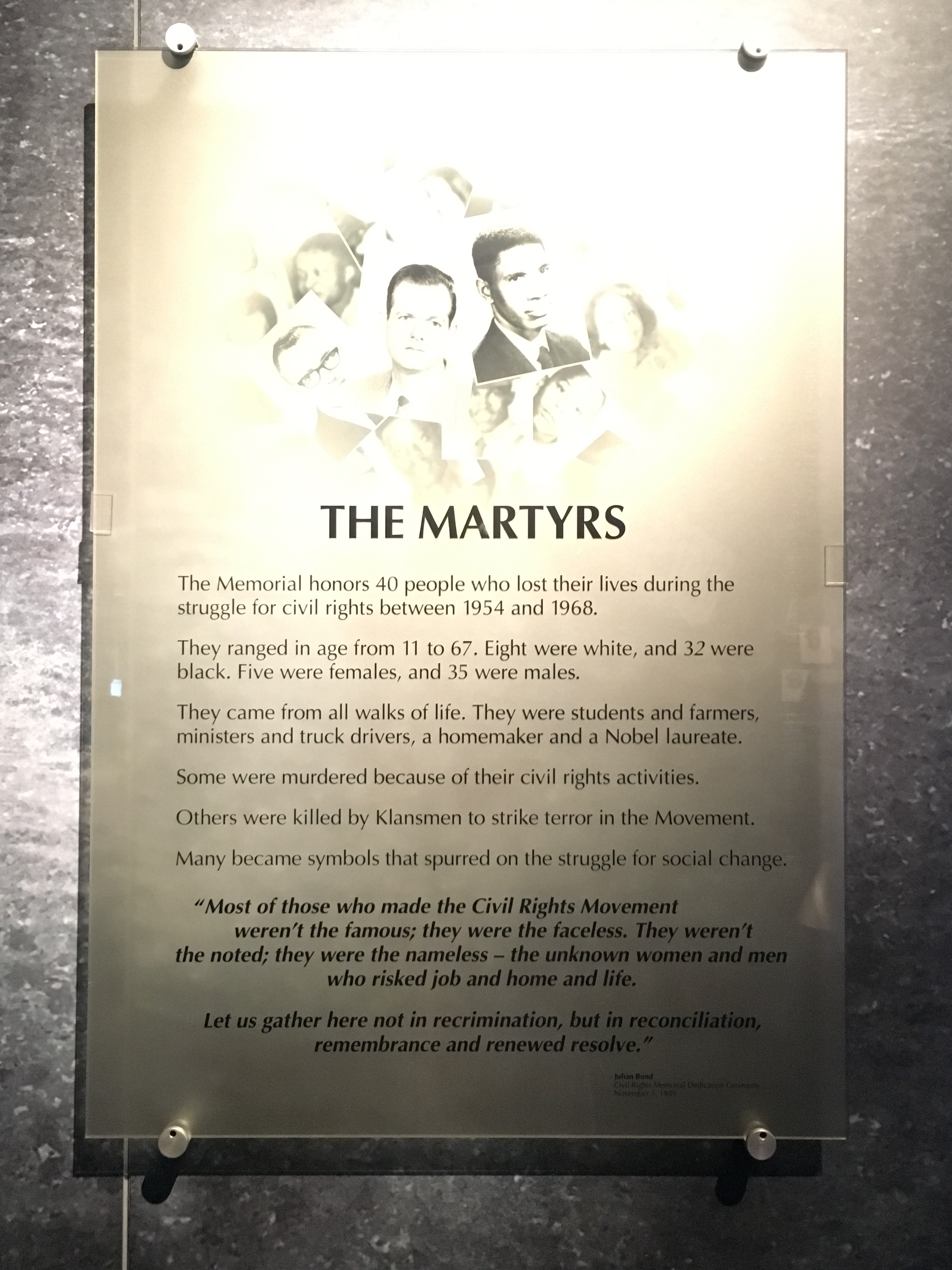 Inside there are videos and exhibits about the martyrs listed on the memorial outside. There is also a Wall of Tolerance that you can sign your name to after taking the pledge. Although this center is small it is worth the stop and the film was good to see, including clips of Rosa Parks at the memorial dedication.